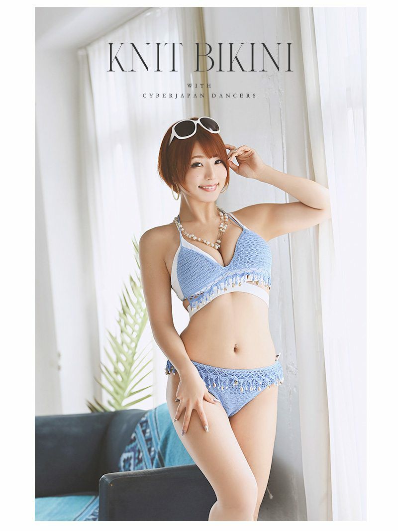 6. 水着 にプラスオン!シェルモチーフ韓国風ニット三角ビキニ上下セット(フリーサイズ)(ブルー/ホワイト/ブラック)