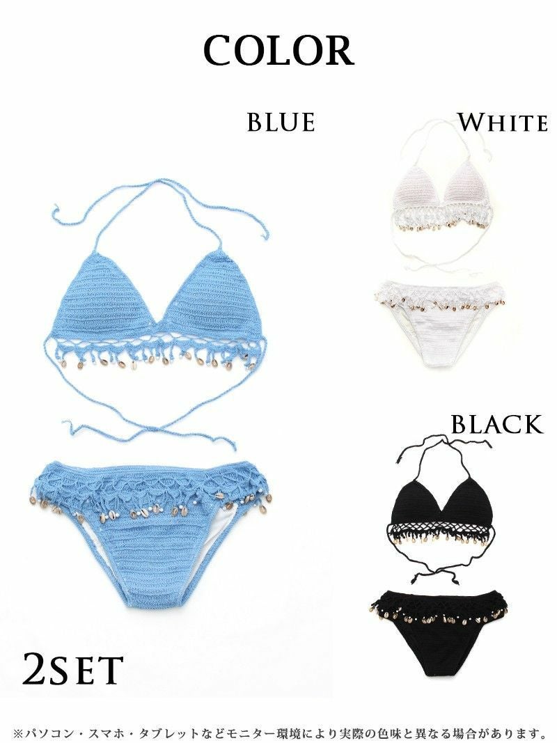 プラスオンでビーチ映え! 水着 にプラスオン!シェルモチーフ韓国風ニット三角ビキニ上下セット(フリーサイズ)(ブルー/ホワイト/ブラック)