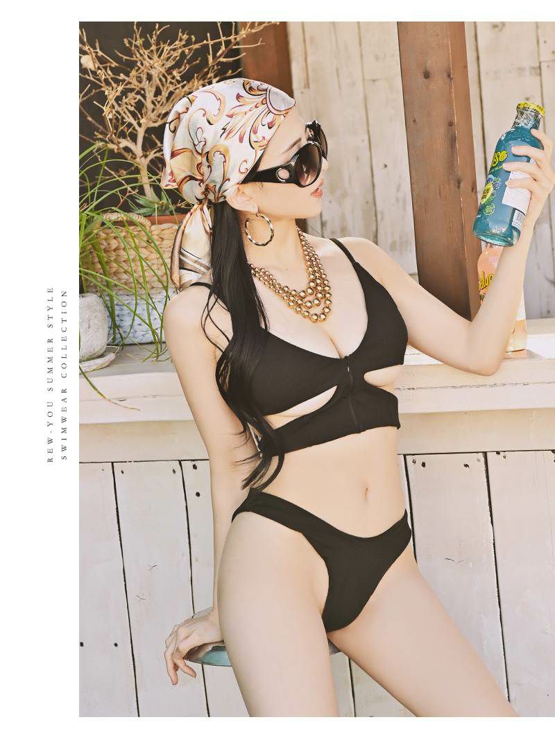 リブ素材で魅せるVカットビキニ 水着 リブ素材ワンカラー前ジップレディースビキニ【Ryuyu】カッティングVカットデザイン水着(M)(ブラック/イエロー)