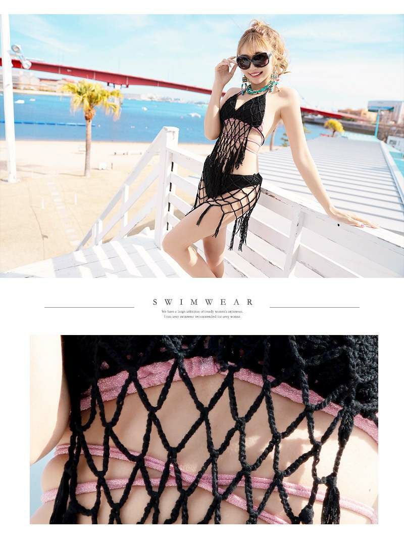 6. 水着 ヒッピー風かぎ編みフリンジビキニ【Ryuyu】(フリーサイズ)(ブラック/ホワイト/ベージュ)
