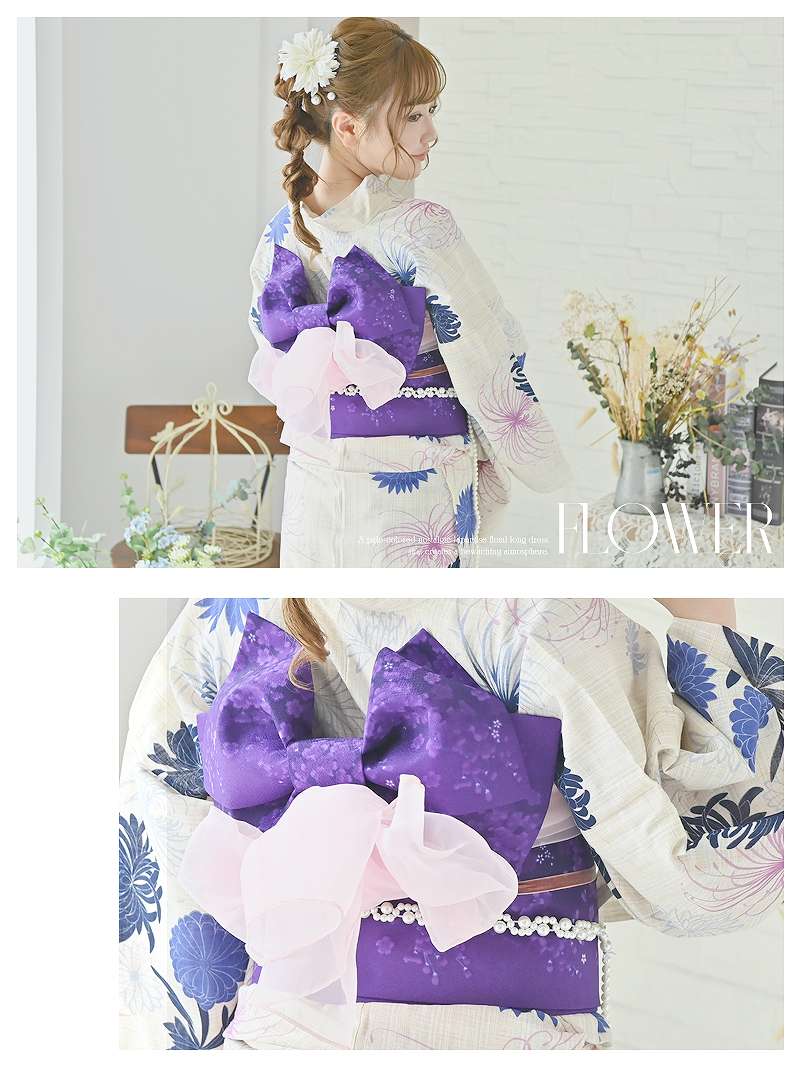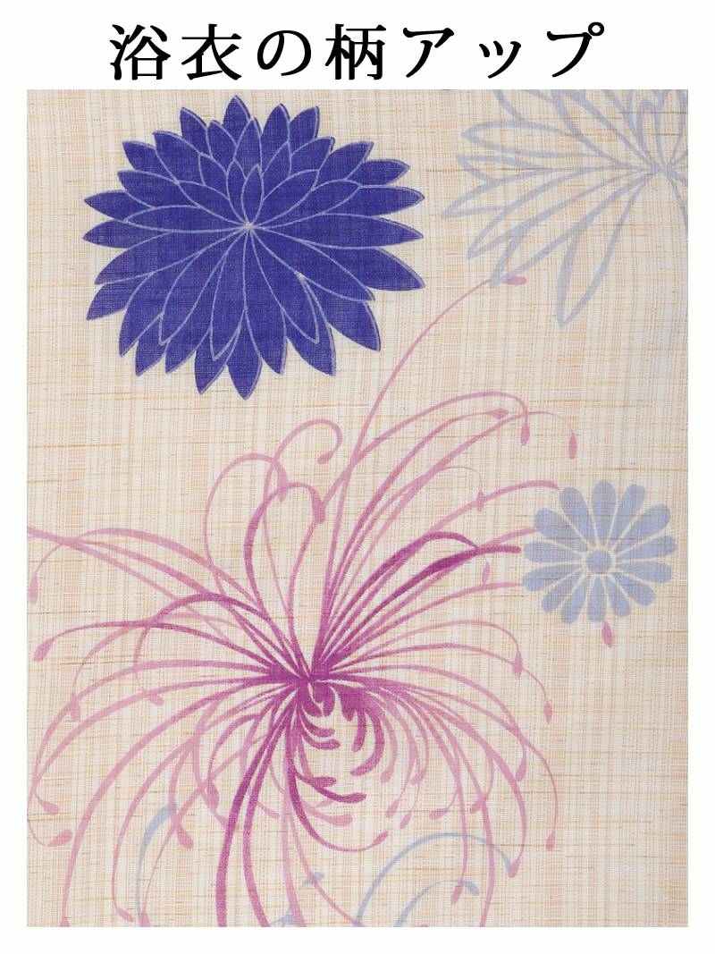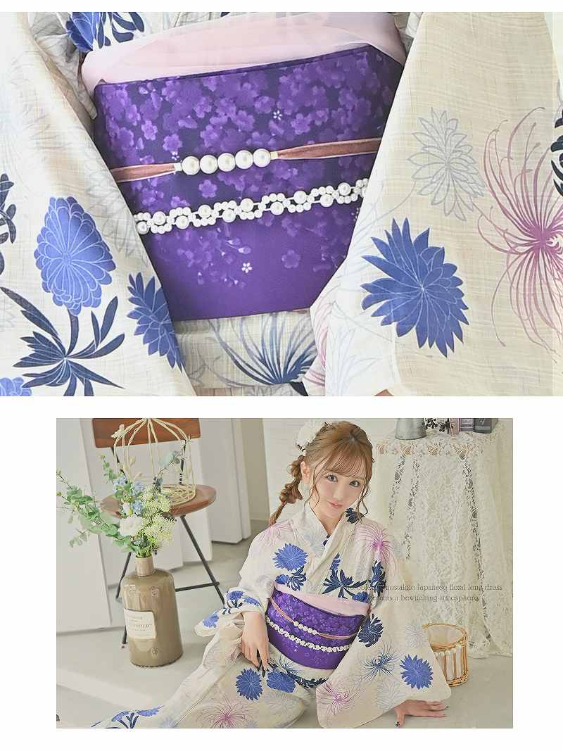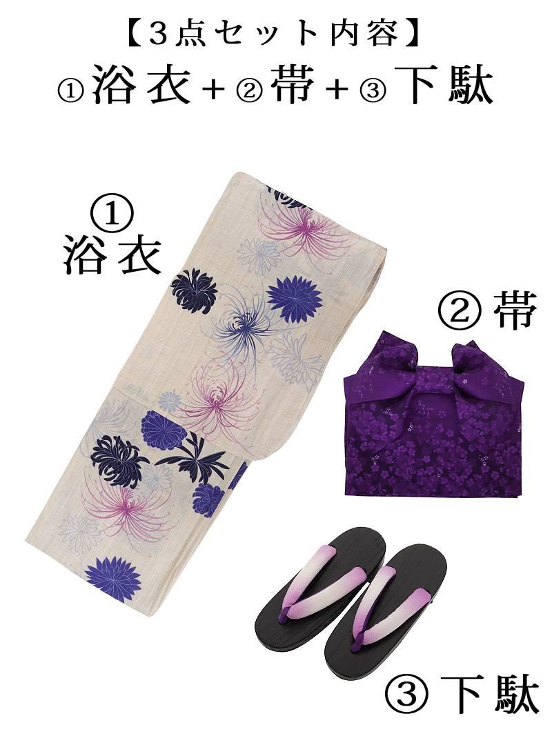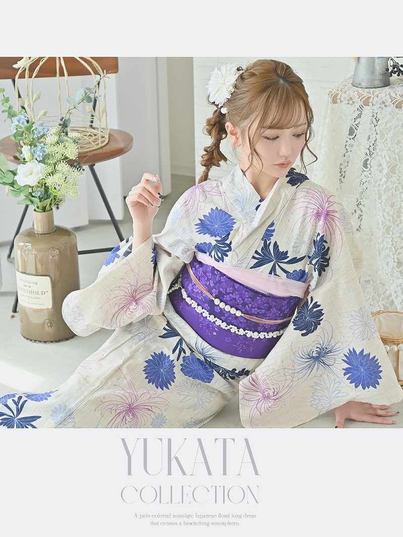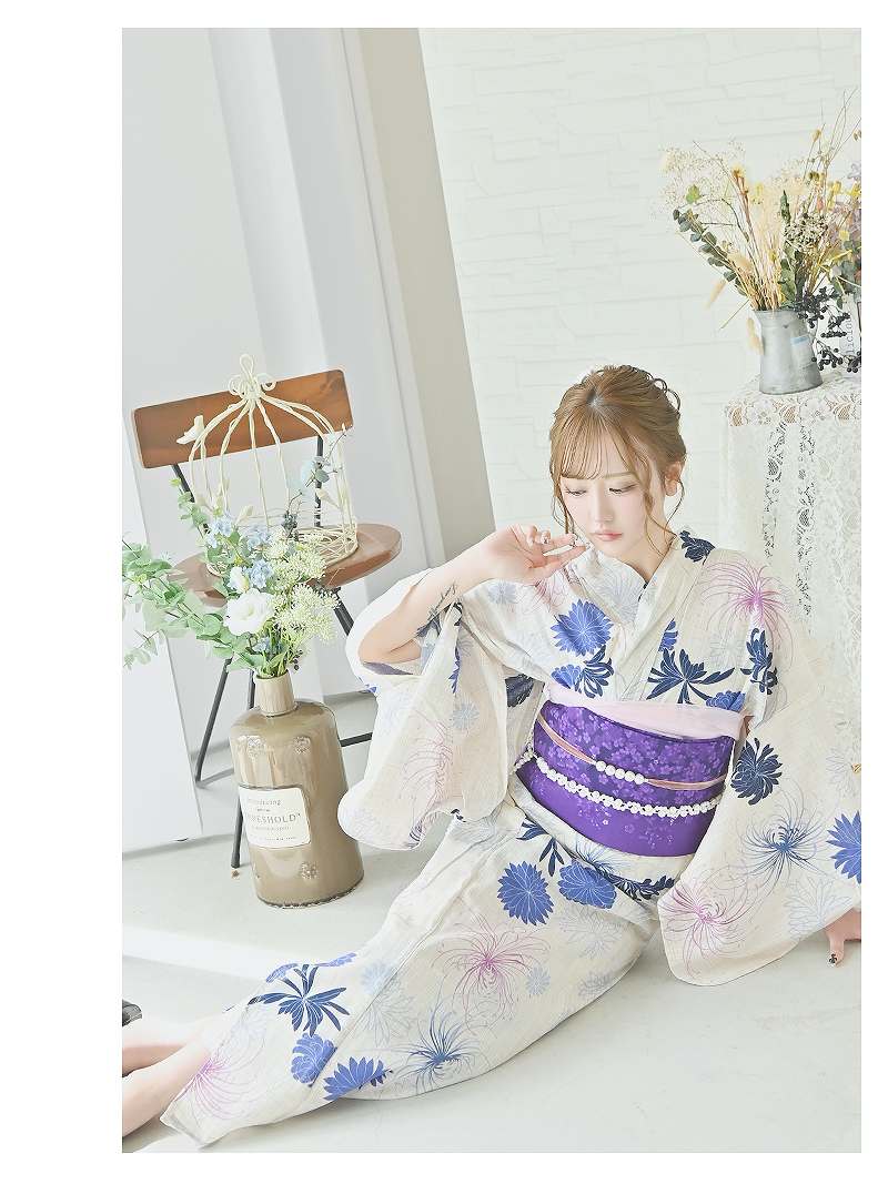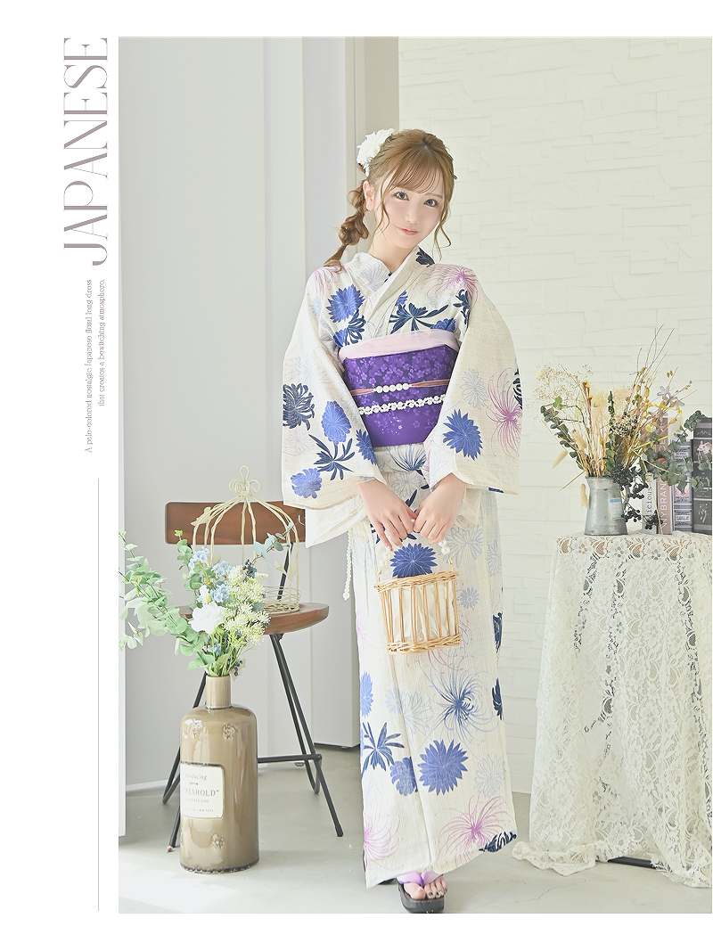 和風モダンな花柄が凛とした美しさを引き立てる、大人ガーリーな浴衣3点セット。 浴衣 きなり地に鮮やかな花柄が映える和風モダンで大人ガーリーな浴衣3点セット りせり 着用 浴衣【Ryuyu】(フリーサイズ)(パープル)