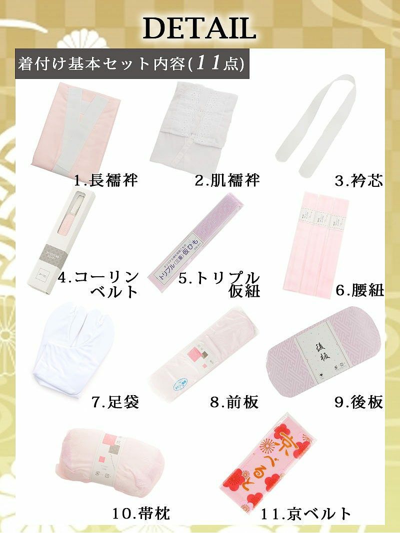振袖・帯・草履・襦袢・帯揚・帯締・重ね衿・半衿・肌着・帯枕・前板・後板・トリプル仮紐・京ベルト・腰紐・衿芯・コーリンベルト・足袋