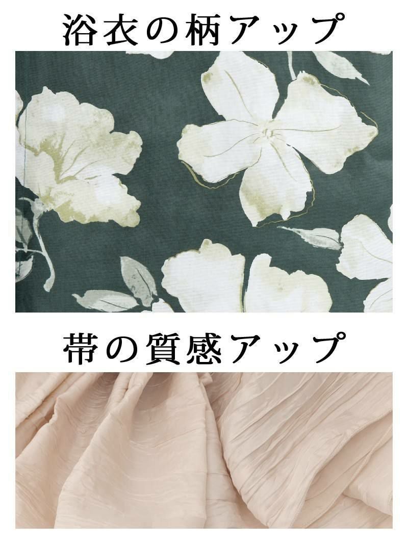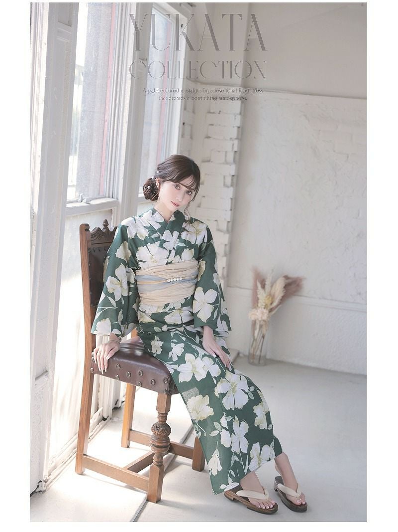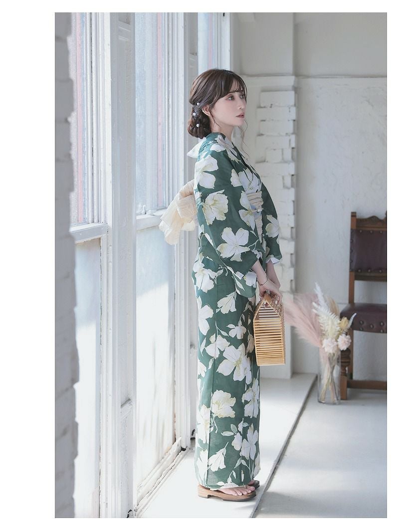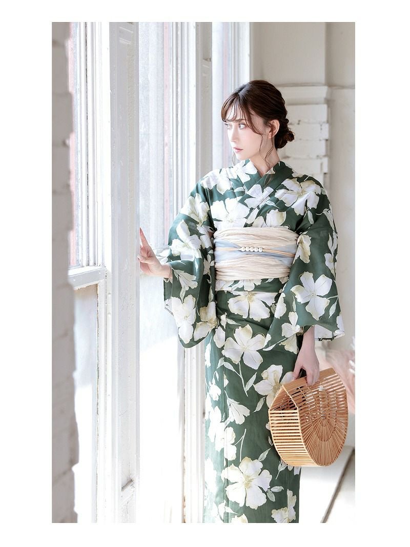 深みのあるグリーンと爽やかなホワイトを基調にした牡丹と花柄が美しいレディース浴衣です。