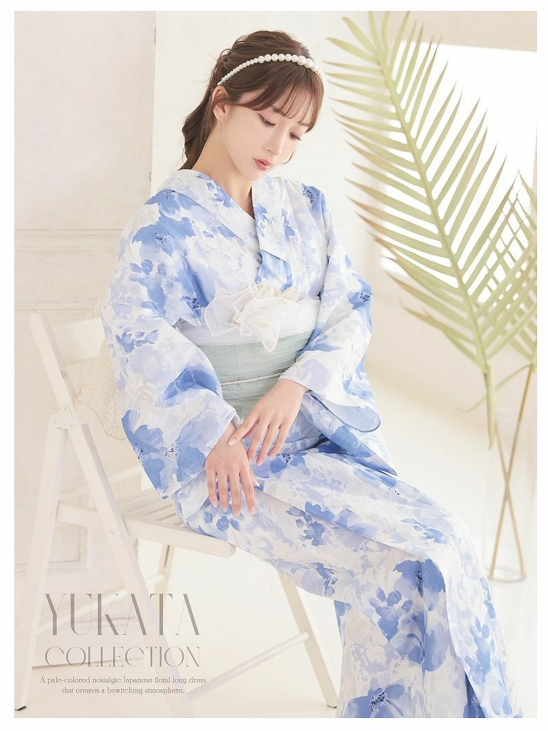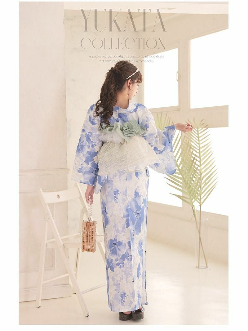 白地にグラデーションブルーのフラワープリントが映える、女性用浴衣です。