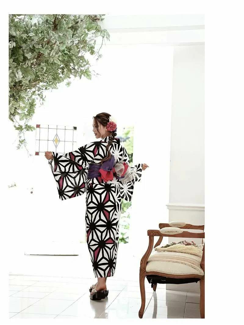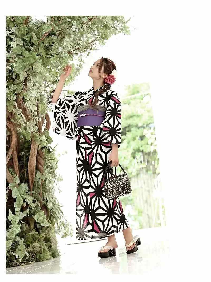 麻の葉柄にピンクが映えるレディース浴衣は半身柄デザインとなっており片方はモノクロなのでレトロモダンな雰囲気のゆかたです。