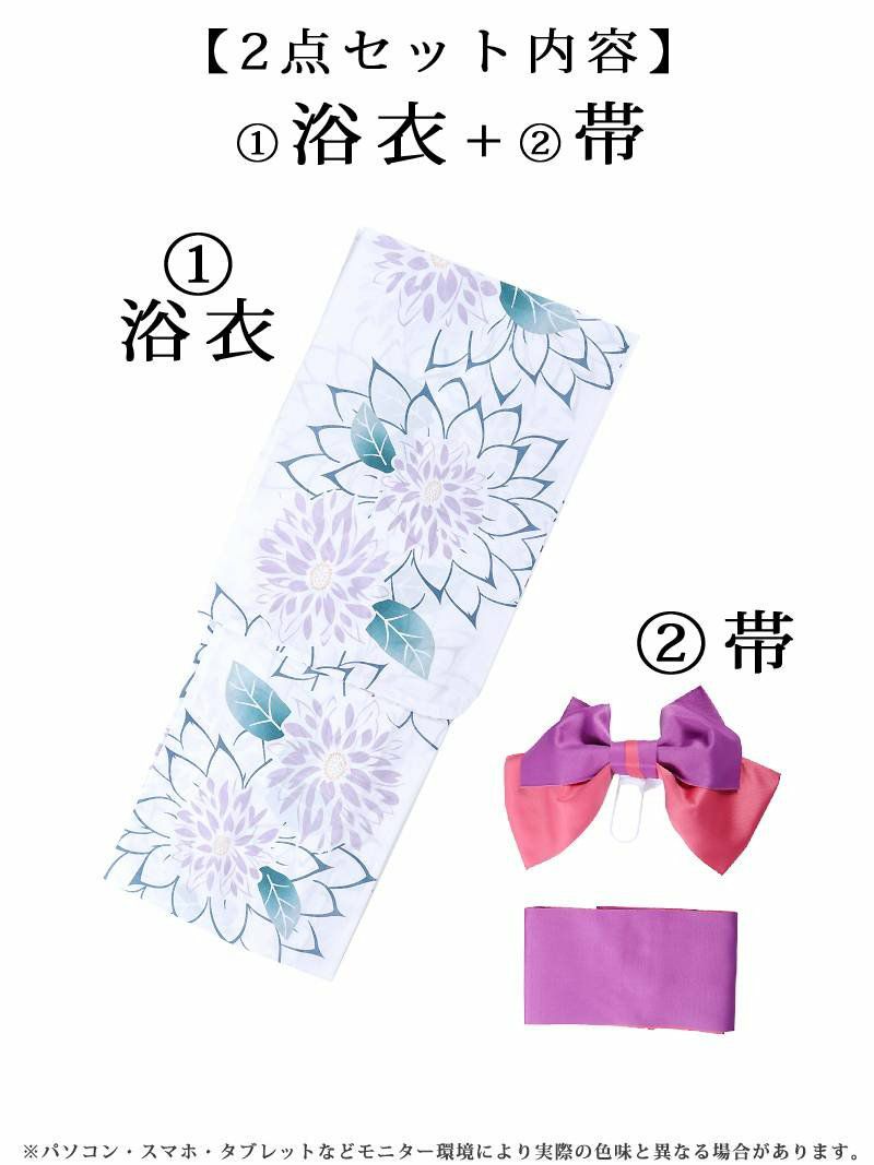 暑い夏に清涼感漂う白地のレディース浴衣にはパープルを基調としたグラデーションカラーの牡丹柄があしらわれ華やかさも演出できるプチプラ浴衣です。