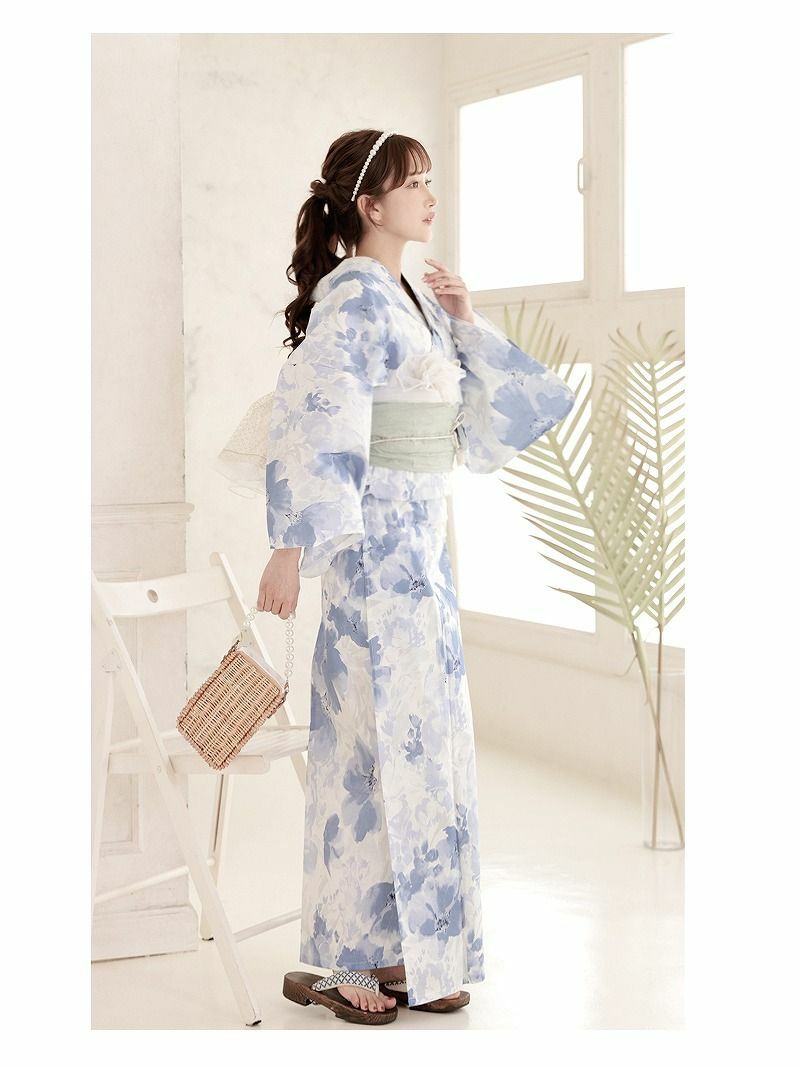 白地にグラデーションブルーのフラワープリントが映える、女性用浴衣です。