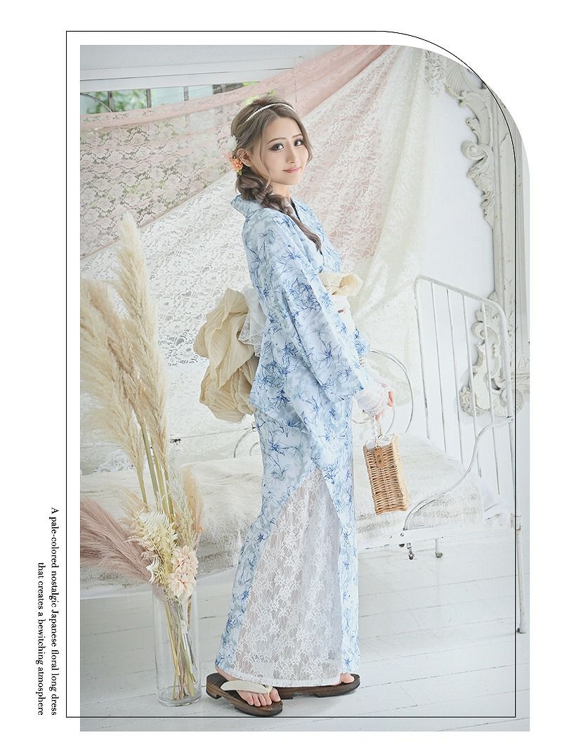 ニュアンスブルーがおしゃれなギャル浴衣と上品なレースの組み合わせで周囲を圧倒させるレディース浴衣です。