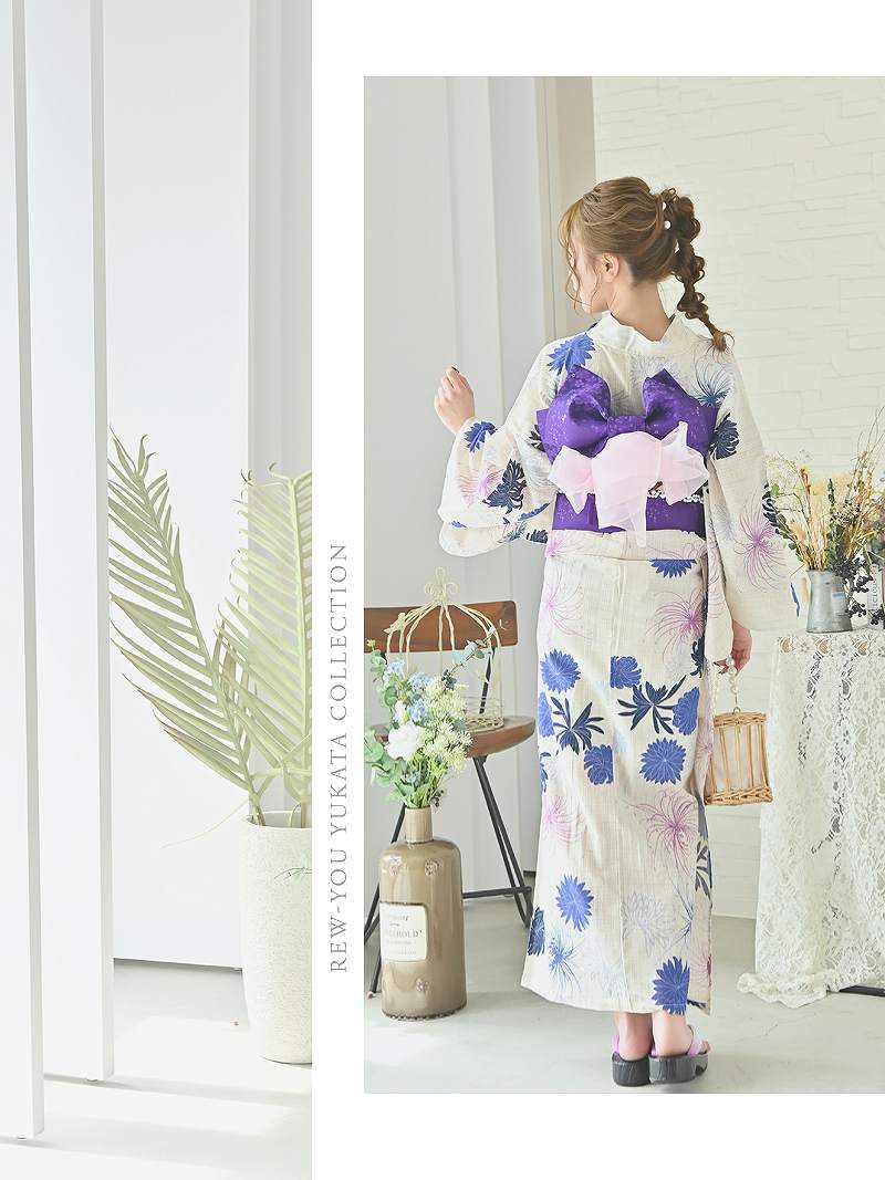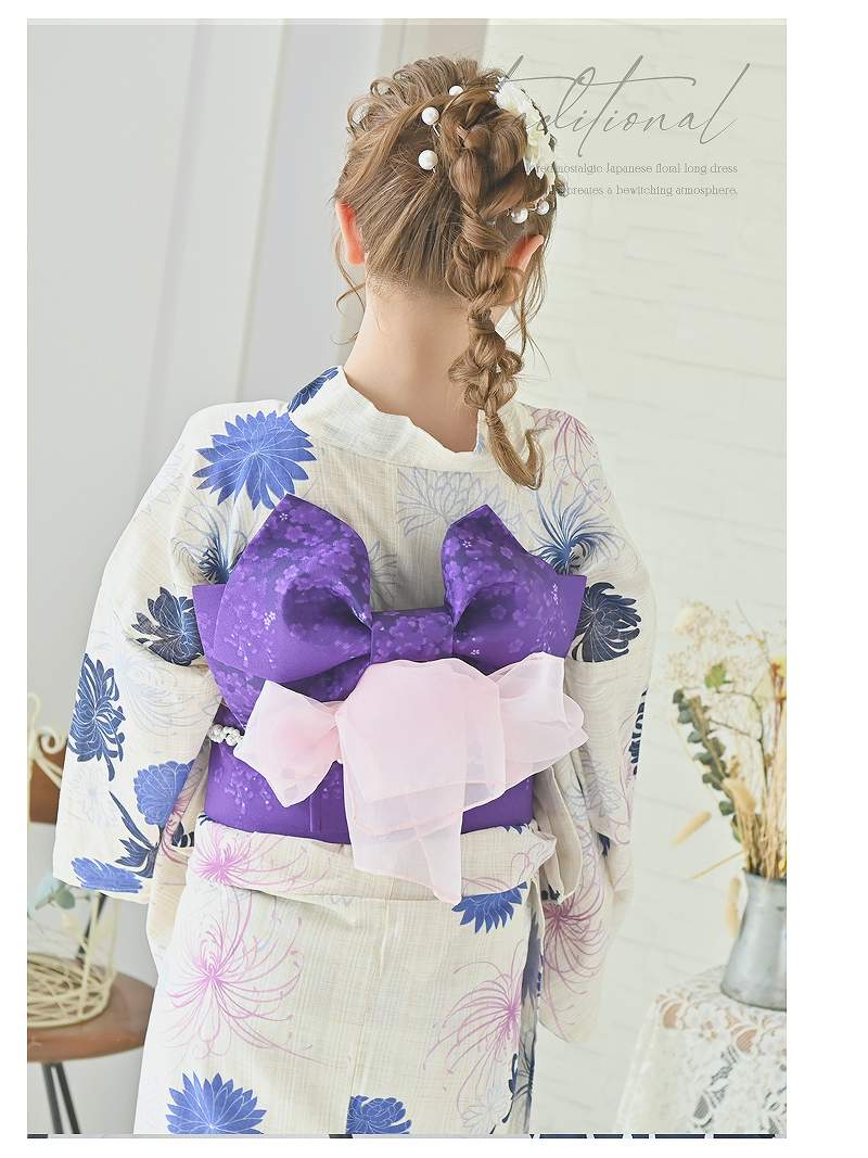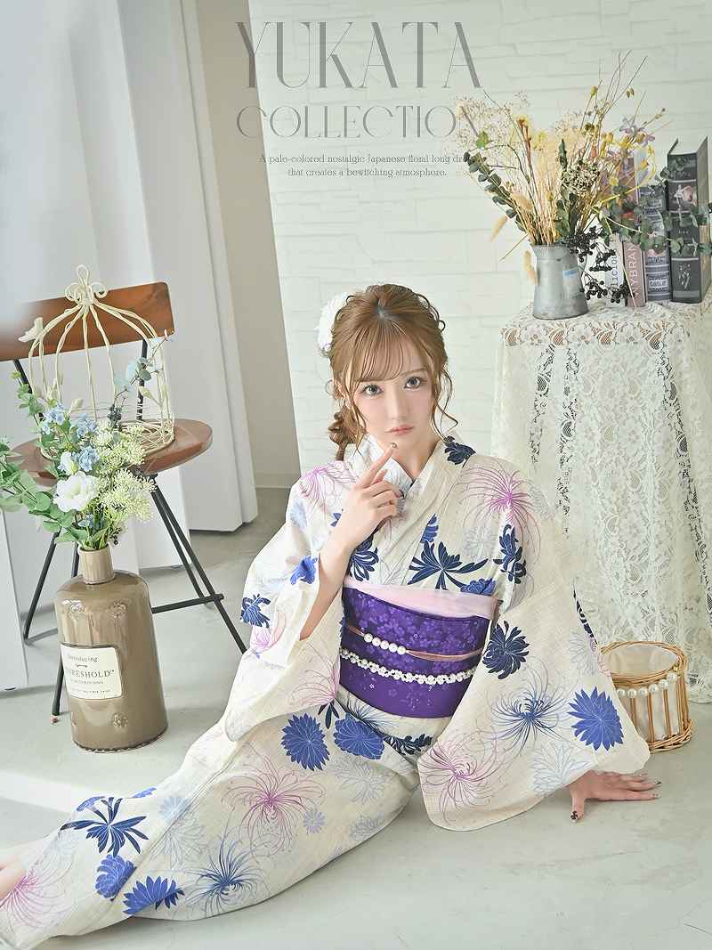 4. 浴衣 きなり地に鮮やかな花柄が映える和風モダンで大人ガーリーな浴衣3点セット りせり 着用 浴衣【Ryuyu】(フリーサイズ)(パープル)