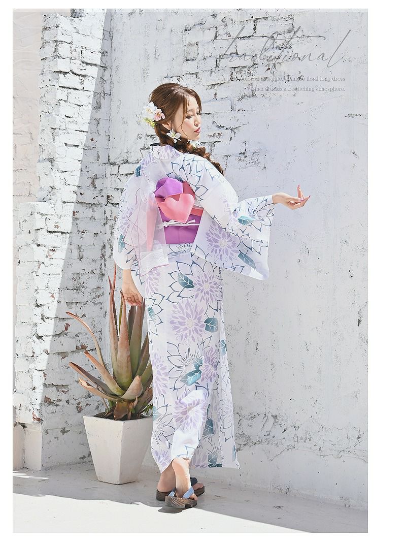 暑い夏に清涼感漂う白地のレディース浴衣にはパープルを基調としたグラデーションカラーの牡丹柄があしらわれ華やかさも演出できるプチプラ浴衣です。
