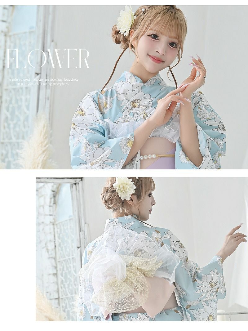 ※予約販売※ベビーブルーがかわいい椿柄セパレート浴衣 あいさ 着用 ギャル浴衣2点セット【Ryuyu】