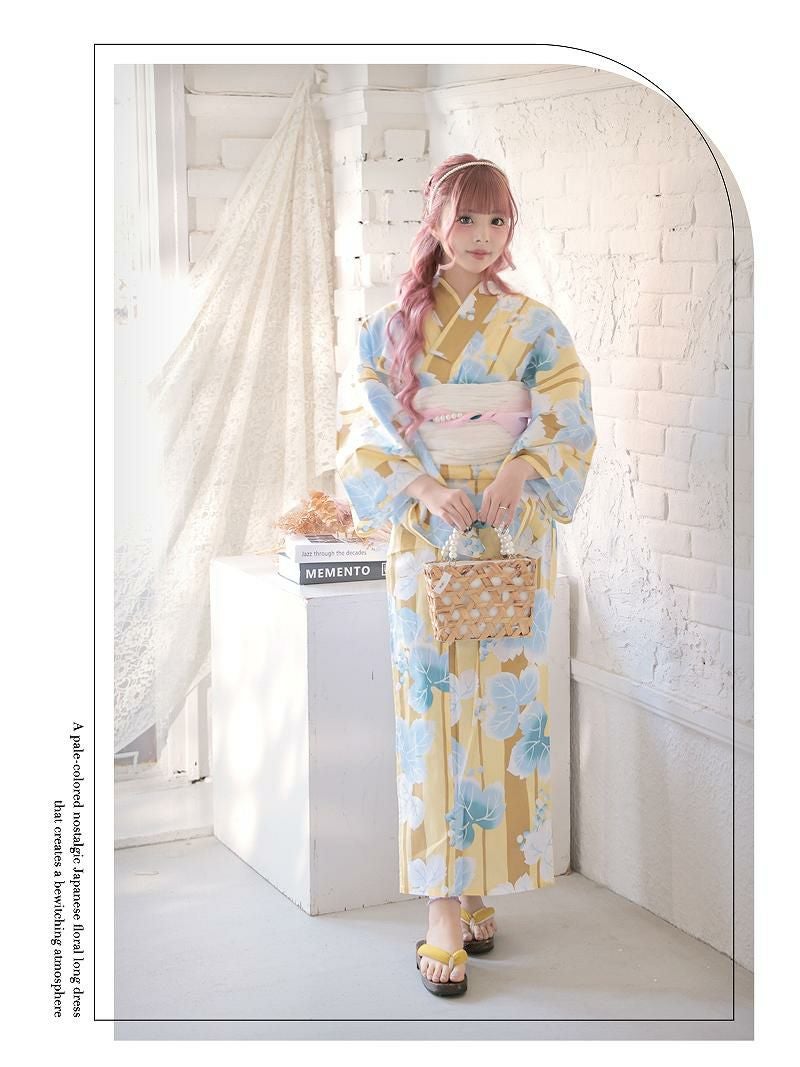 訳あり超かわいい和テイスト 【訳ありアウトレット】可愛い蓮のお花柄イエロー&ブルーの縦縞キャバ浴衣 あいさ 着用 ギャルゆかた【Ryuyu】(フリーサイズ)(イエロー)