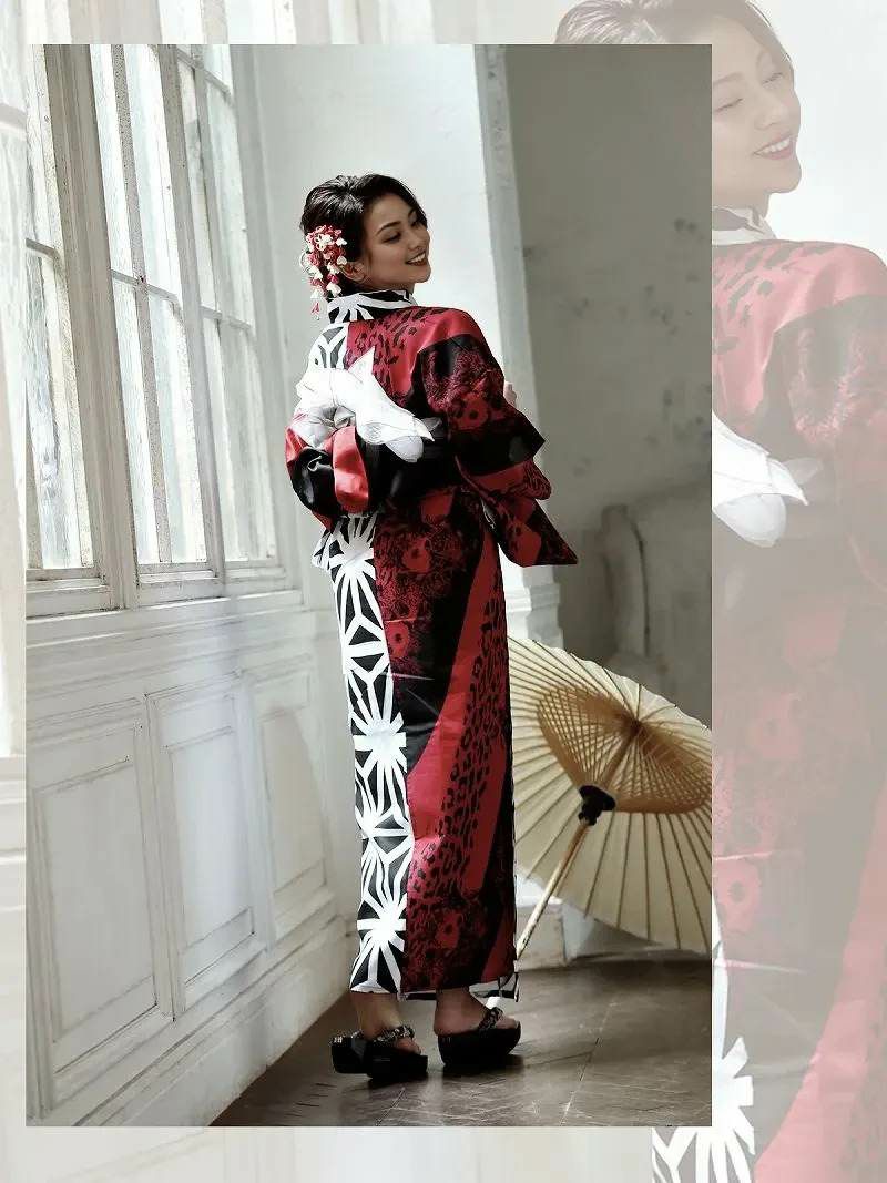 白×赤地のかっこいいレディース浴衣は半身柄デザインだから左右で印象が変わるレディース浴衣♪