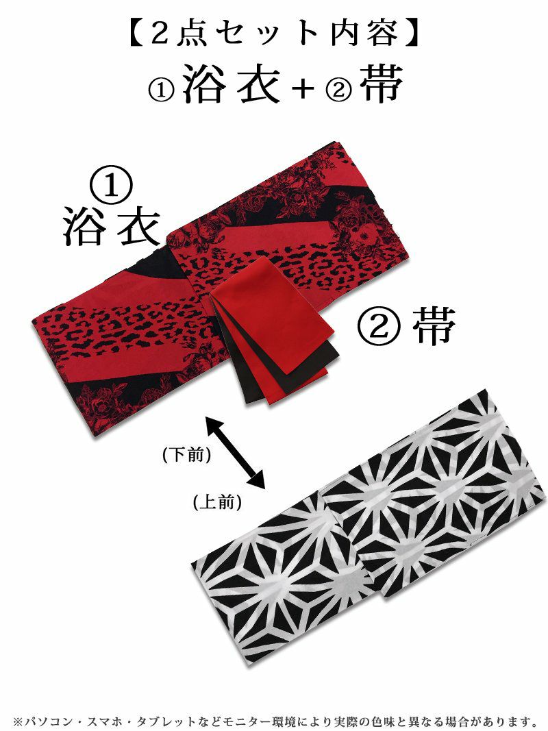 5. 浴衣 半身柄レオパード×リーフ柄レディース浴衣【Ryuyu】SNS映え◎な大人かっこいいゆかた(フリーサイズ)(レッド)