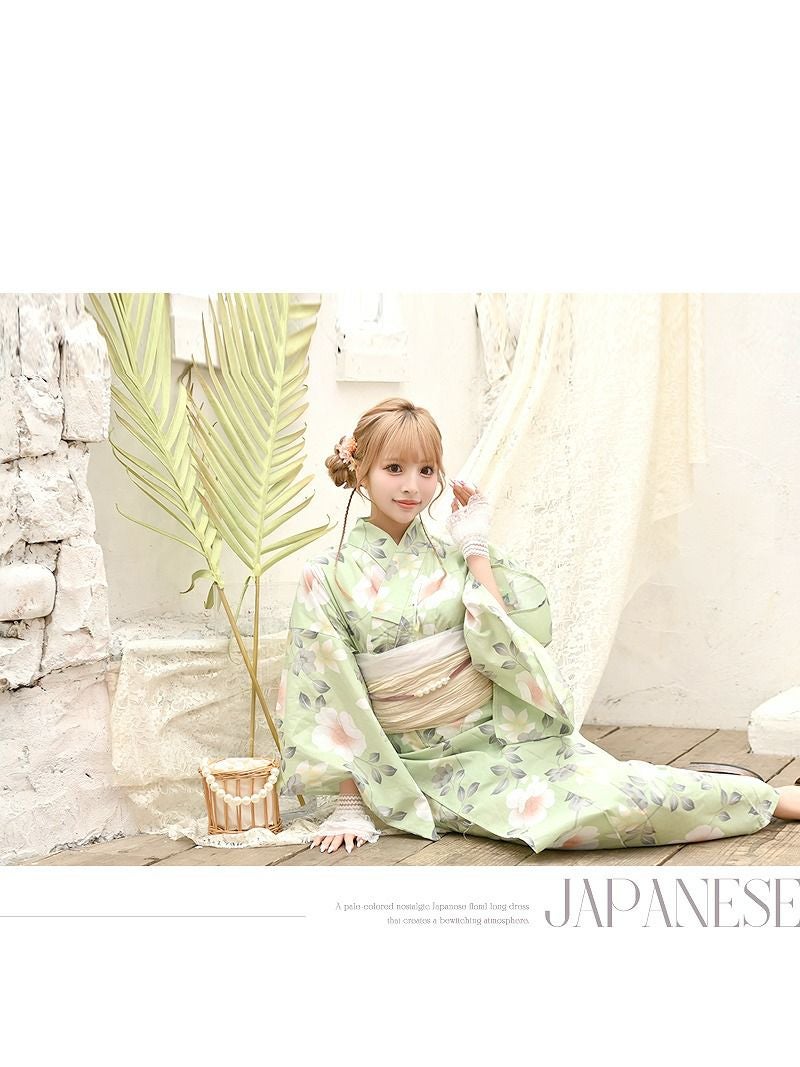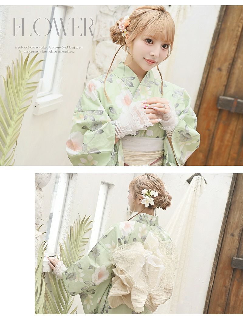 4. 浴衣 華やかグリーンに牡丹がかわいいセパレート浴衣 あいさ 着用 ギャルゆかた2点セット【Ryuyu】(フリーサイズ)(ライトグリーン)