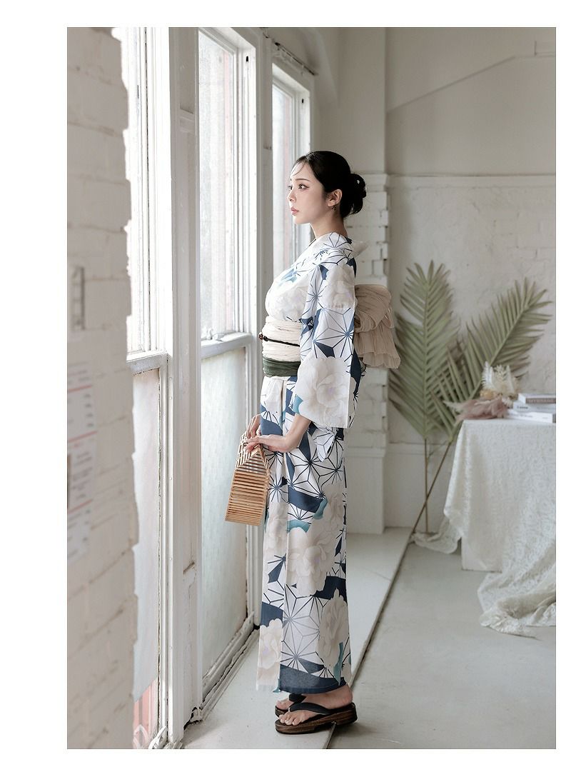 4. 浴衣 レトロモダンなブルーリーフに咲く牡丹レディースセパレート浴衣 KANO 着用 二部式浴衣【Ryuyu】(フリーサイズ)(ホワイト)