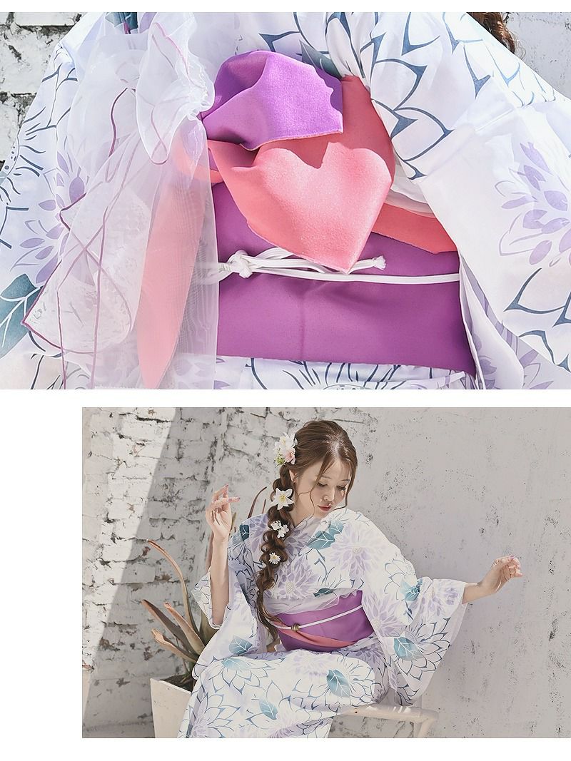 暑い夏に清涼感漂う白地のレディース浴衣にはパープルを基調としたグラデーションカラーの牡丹柄があしらわれ華やかさも演出できるプチプラ浴衣です。