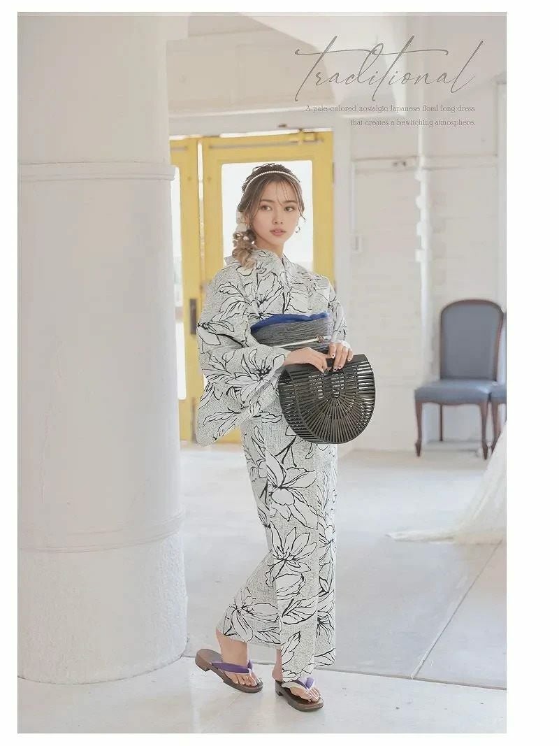 大人の魅力お得3点セットで楽しむ 浴衣 お得な3点セット!!大人配色花柄フラワーキャバ浴衣 【Ryuyu】setでお得なレトロレディースゆかた(フリーサイズ)(ホワイト)