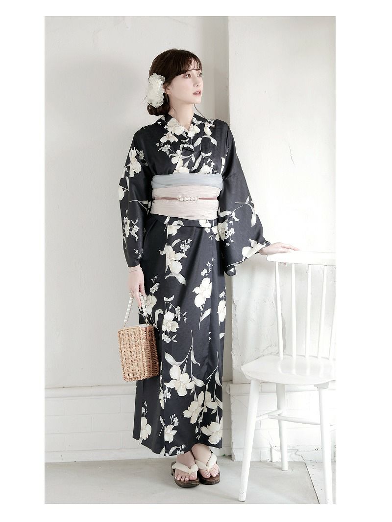 ちょっぴり大人顔になれるモダン浴衣☆ 浴衣 百合大花柄モノトーンゴシック浴衣 あいみん 着用レディースゆかた【Ryuyu】(フリーサイズ)(ブラック)