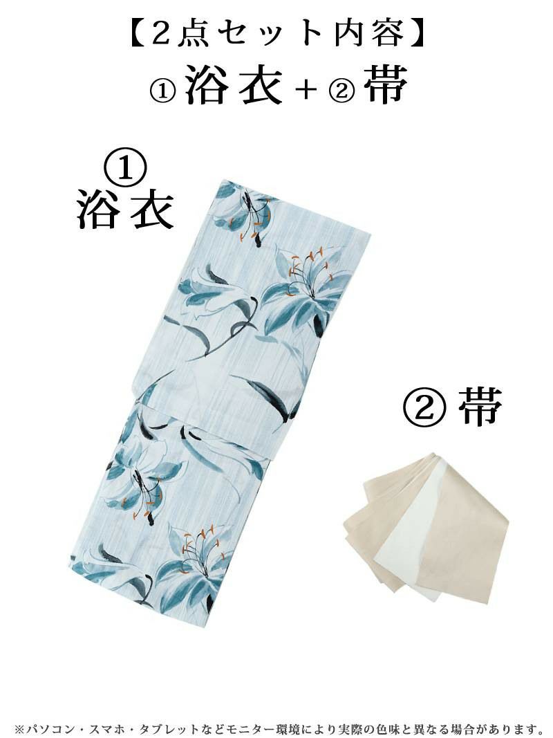 可憐な百合の花が清らかな美しさを演出 浴衣 ホワイト×ブルー百合柄レディース浴衣2点セット【Ryuyu】(フリーサイズ)(ホワイト)