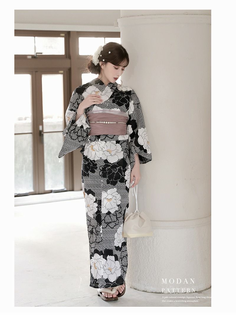 ワンランク上の大人っぽさを醸し出せる 浴衣 高級牡丹柄黒赤×黒白半身柄浴衣 ゆずは 着用 レディースゆかた2点セット(フリーサイズ)(レッド×ホワイト)