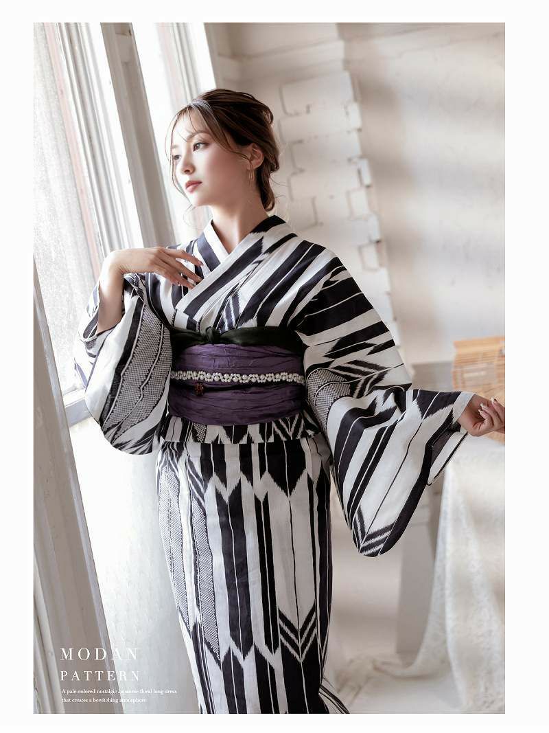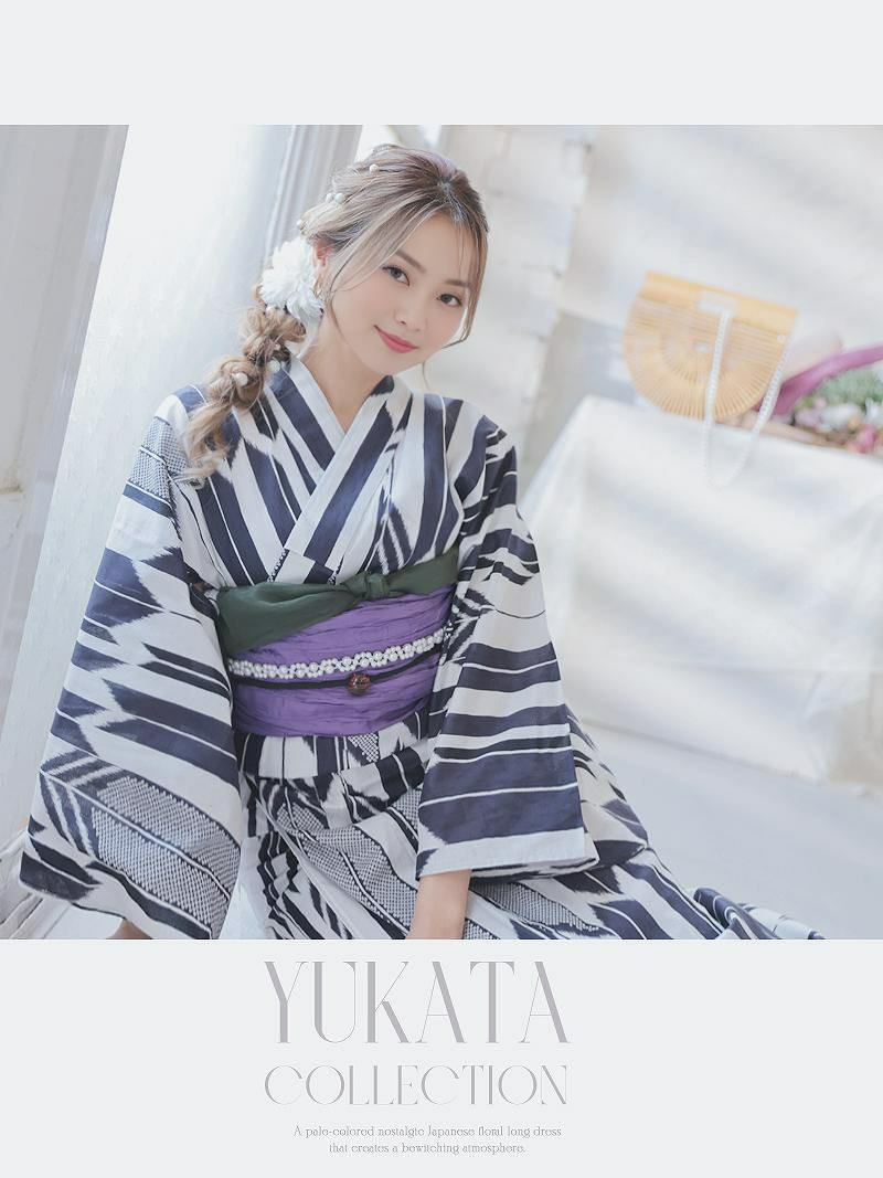 波紋×ストライプ柄のレディース浴衣 モノトーンストライプ波紋柄浴衣 RIRI 着用レディース浴衣3点セット(フリーサイズ)(ホワイト×ネイビー)
