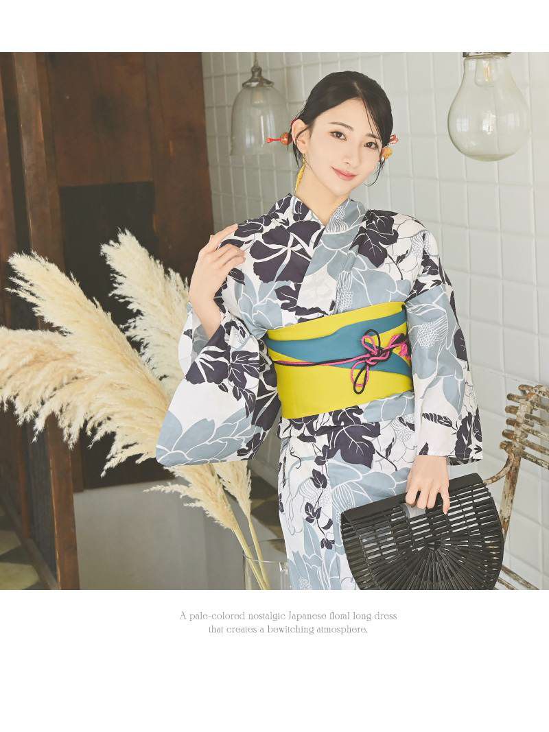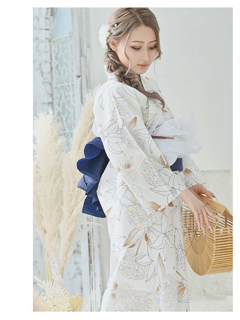大人の魅力お得3点セットで楽しむ 浴衣 お得な3点セット!!大人配色花柄フラワーキャバ浴衣 【Ryuyu】setでお得なレトロレディースゆかた(フリーサイズ)(ホワイト)