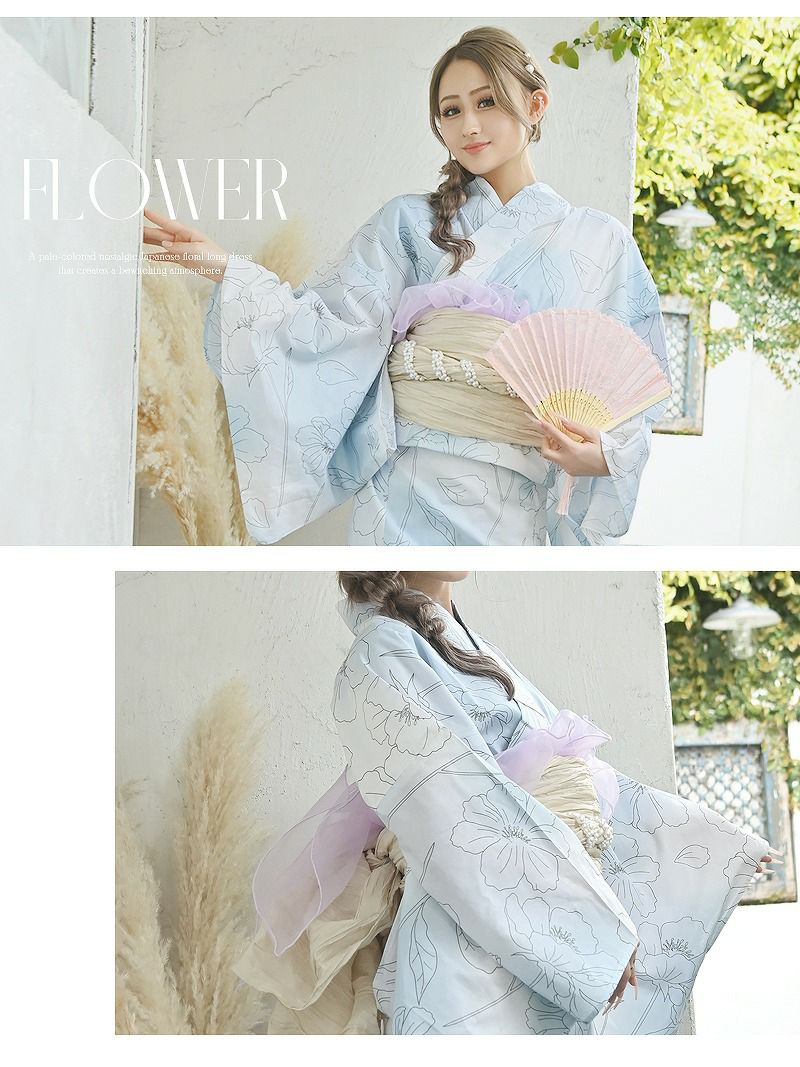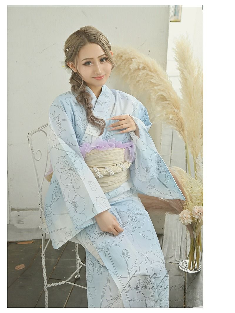 上品さと可憐さをまとえる、涼やか浴衣 グラデーションブルーが美しい大人のフラワーレディース浴衣2点セット【Ryuyu】(フリーサイズ)(ブルー)