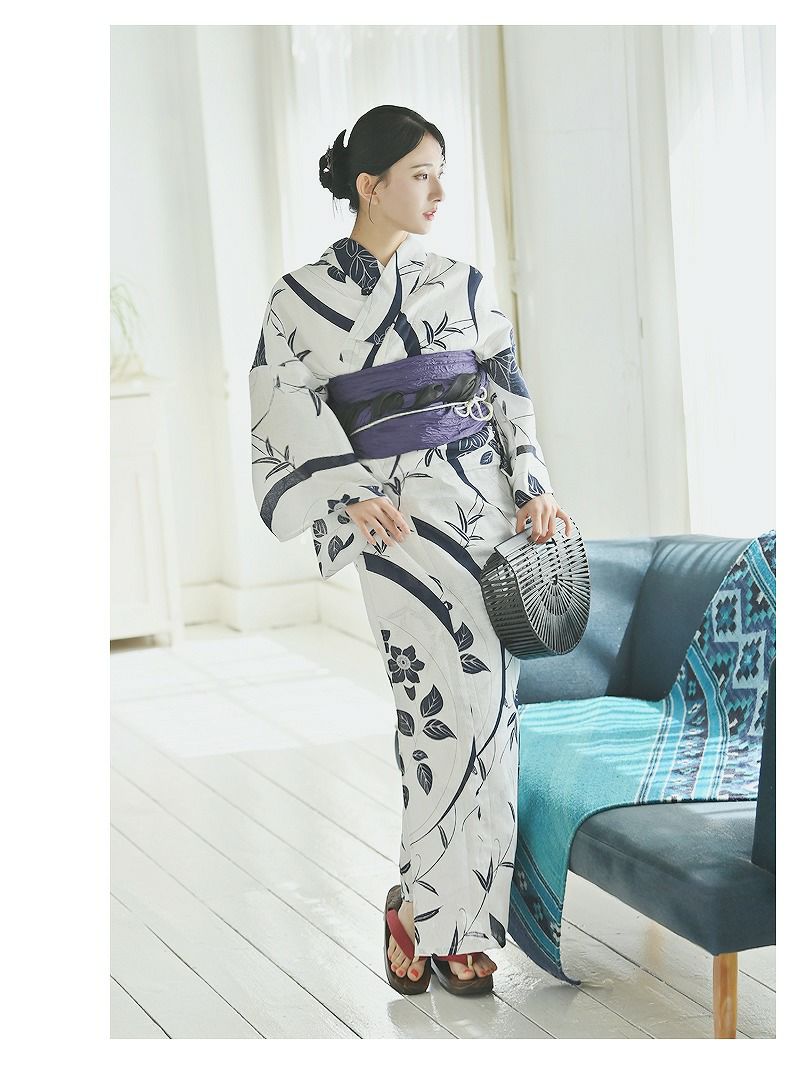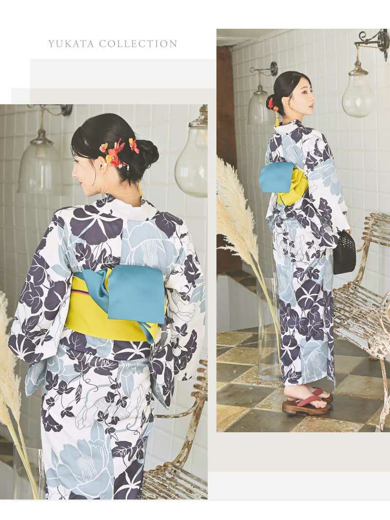爽やかセクシーな夏っぽ浴衣セット 浴衣 花柄リバーシブル半幅帯付きレディース浴衣3点セット【Ryuyu】(フリーサイズ)(ホワイト)