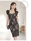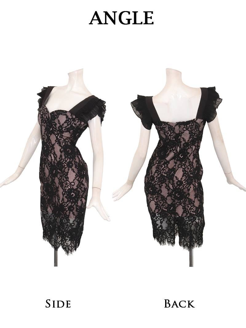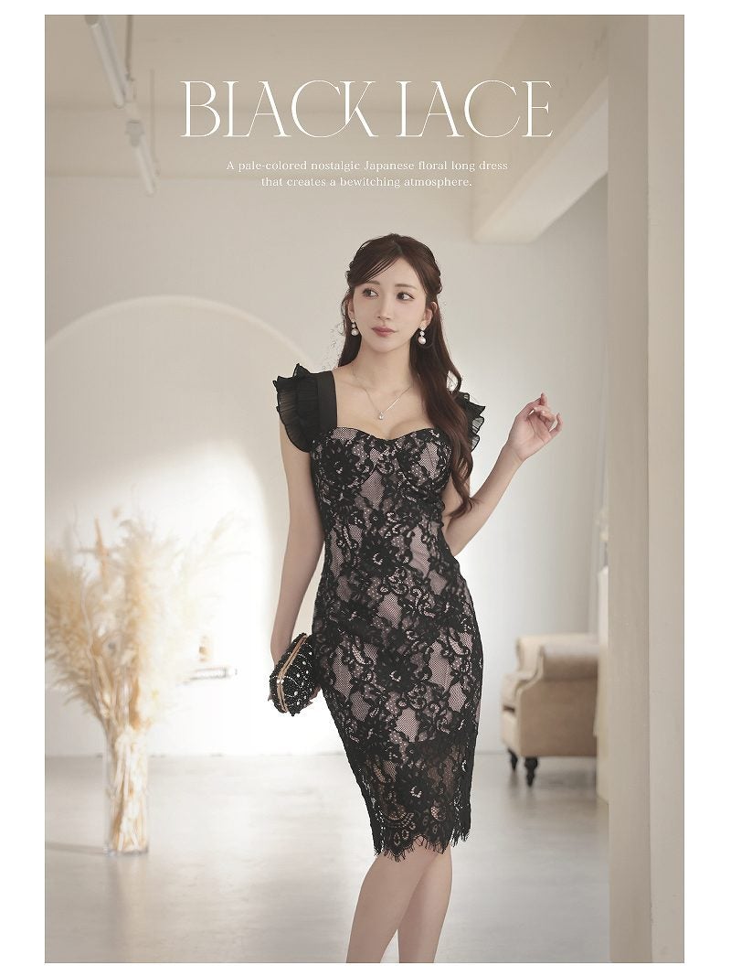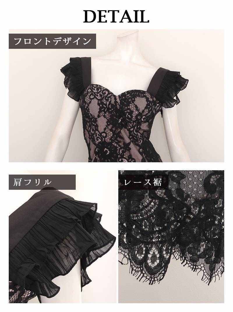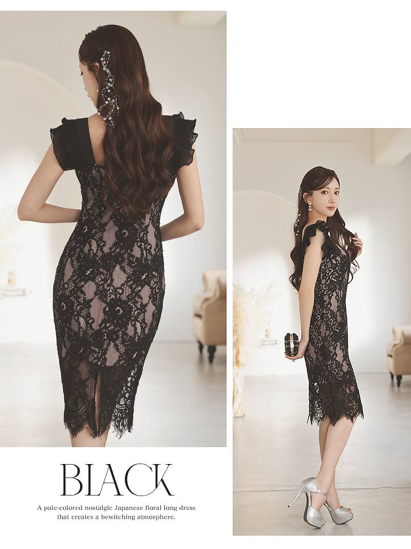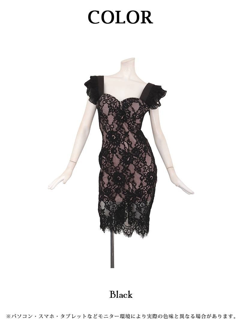 4. 上質フロッキーレースと裏地ピンクを重ねたセクシーなコルセット風膝丈キャバドレス 【Ryuyu】(S/M/L/XL(2L))(ブラック)