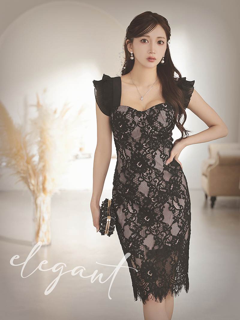上質なフロッキーレースを贅沢に重ねた、透け感が魅力のタイトドレスです。