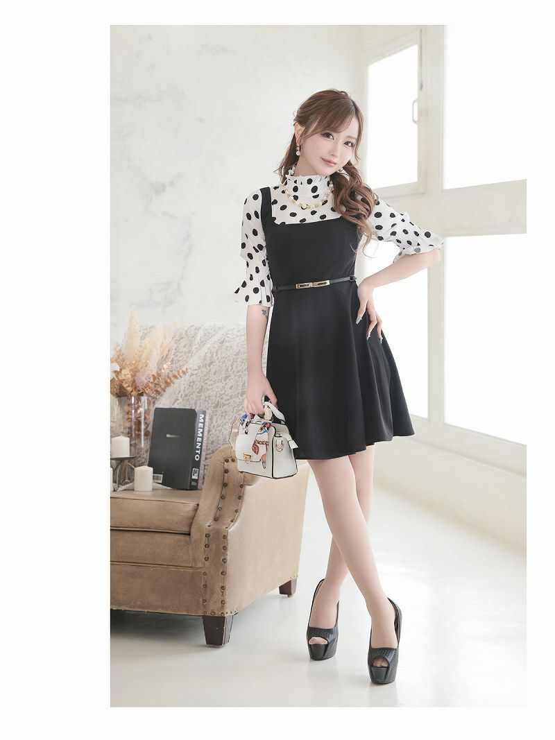谷間&体型カバーも叶える、盛れるプチプラキャバドレス 先行予約割¥4680→¥4446!※予約販売※アシンメトリーシフォン袖ビジューミニドレス りせり 着用 キャバドレス【RyuyuChick】(S/M/L/XL(2L))(ホワイト/ブラック)