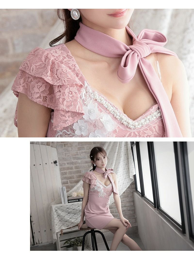 4. 立体刺繍ワンショルダーレースデザインタイトキャバドレス【Ryuyu】(S/M/L)(ピンク/ミント) ptpl