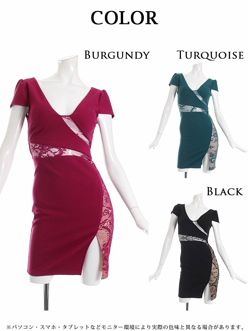 ブラックレースでえちかわ バイカラーブラックレース袖付きキャバドレス【RyuyuChick】(S/M/L/XL)(ネイビー/ワイン)