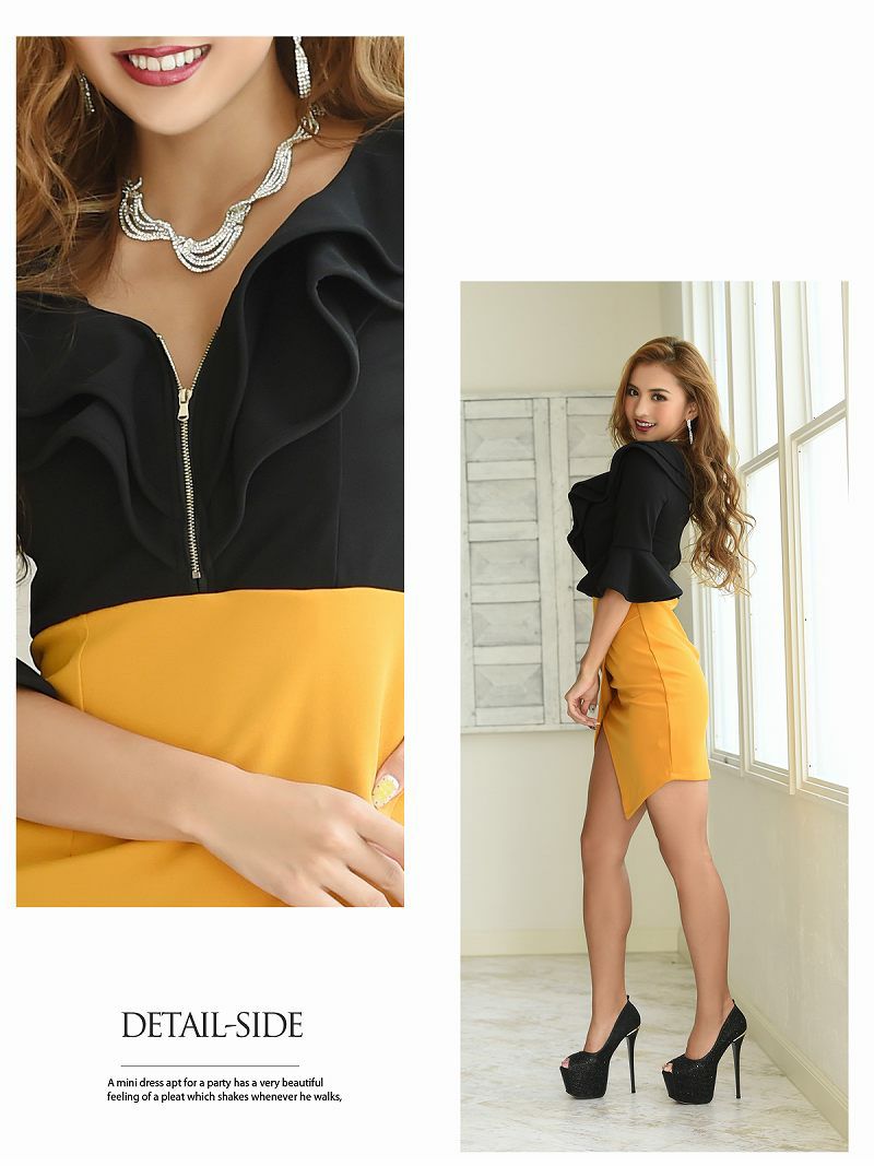4. フリルとベルスリーブが魅力のバイカラーキャバドレス【RyuyuChick】(S/M/L/XL)(ブラック×イエロー/ブラック×ワイン/ホワイト×ネイビー/ホワイト×グリーン/ホワイト×ピンク/ホワイト×ブルー)