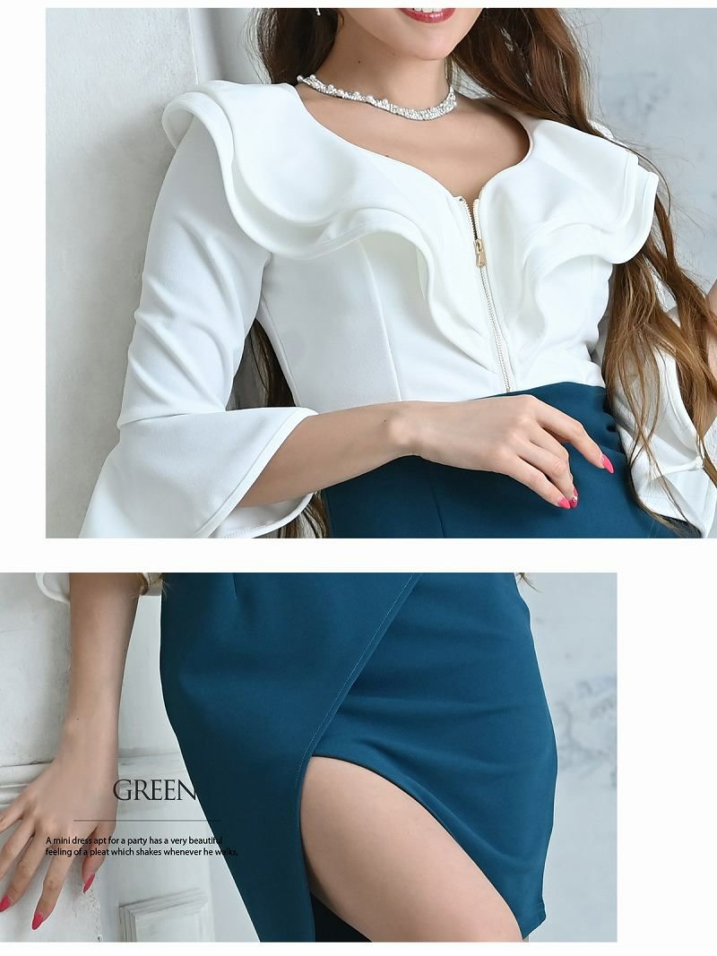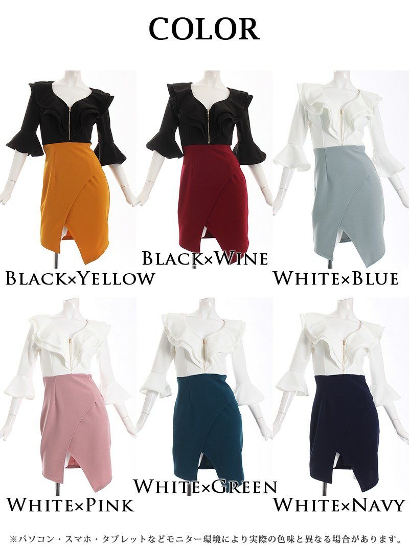 魅惑のシルエット フリルとベルスリーブが魅力のバイカラーキャバドレス【RyuyuChick】(S/M/L/XL)(ブラック×イエロー/ブラック×ワイン/ホワイト×ネイビー/ホワイト×グリーン/ホワイト×ピンク/ホワイト×ブルー)