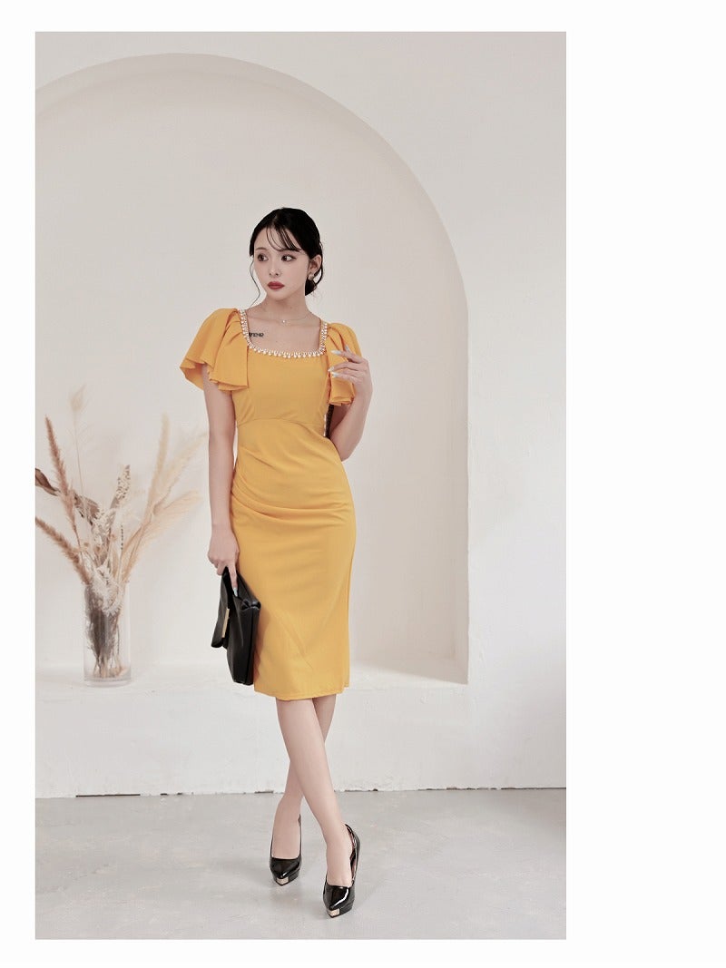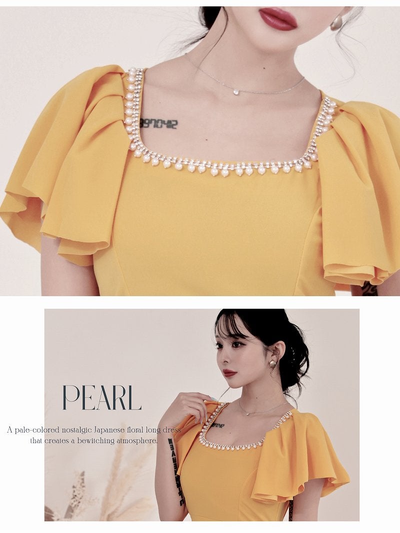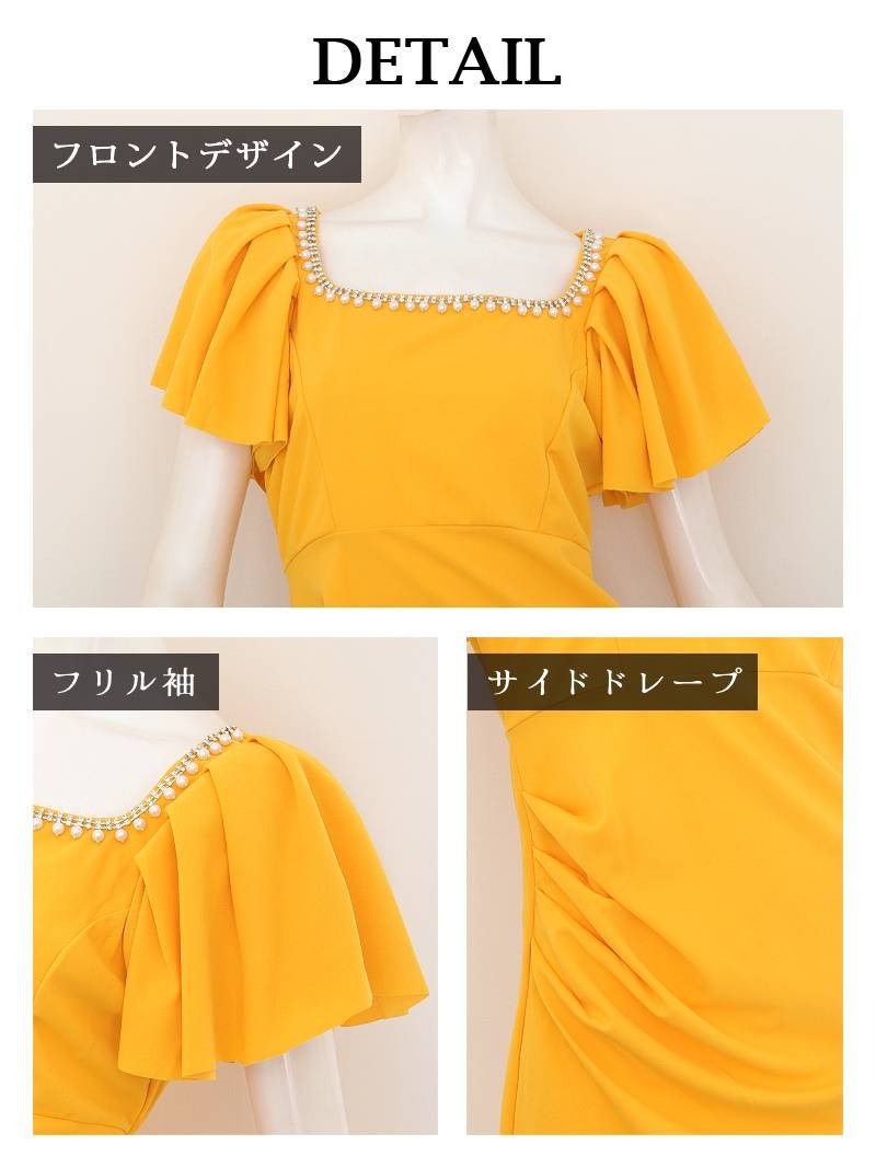 パールビジューとフリル袖で圧倒的な華やかさを放つ、韓国風の足長タイトドレス。 パールビジュー付き二重フリル袖ハイウエスト切り替えタイトキャバドレス 韓国style足長ミニワンピ KANO 着用 キャバワンピース【DaysPiece】(S/M/L/XL(2L))(ブラック/イエロー)