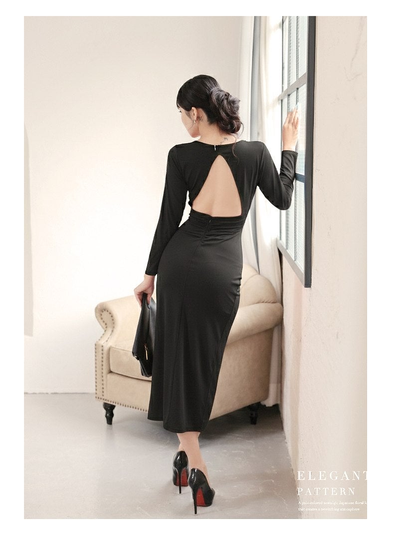 大胆な背中みせとサイドギャザーの魔法で洗練されたシルエットを手に入れる。 ※一部予約販売※背中みせデザインで色気を放つ韓国風長袖ワンピース KANO 着用 キャバワンピース【DaysPiece】(S/M/L/XL(2L))(ワイン/ブラック)
