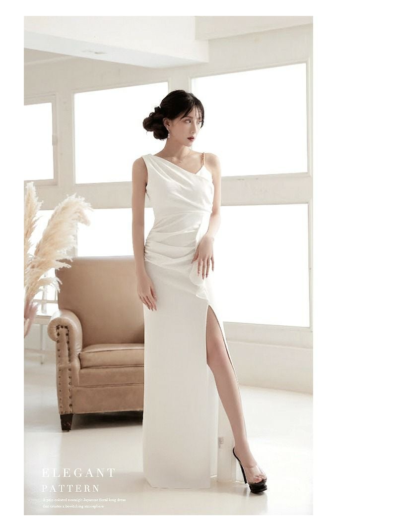 ゴールドチェーンと大胆スリットで魅せる、都会的でセクシーなタイトロングドレス。 先行予約割¥7980→¥7581!※一部予約販売※チェーンストラップワンショルダー深スリットタイトロングキャバドレス 加賀美早紀 着用キャバスーツ【BelsiaLUX】(S/M/L/XL(2L))(ホワイト/レッド/ブラック)