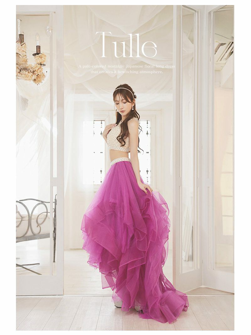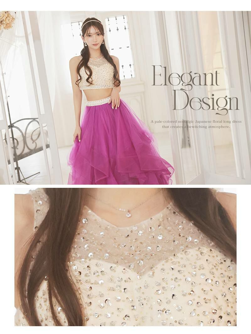 輝くビジューが華やかセットアップ 豪華ビジューロングオーガンジー2Pキャバクラドレス【Ryuyu】ノースリーブ前ミニセットアップドレス(S/M/L)(ベビーピンク/チェリーピンク/パープル)