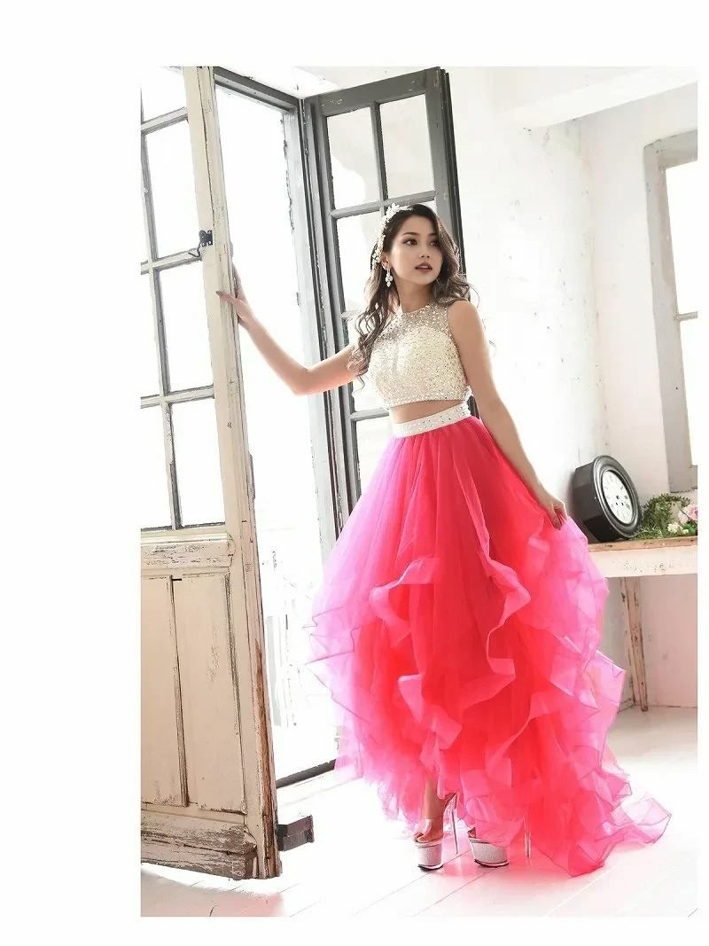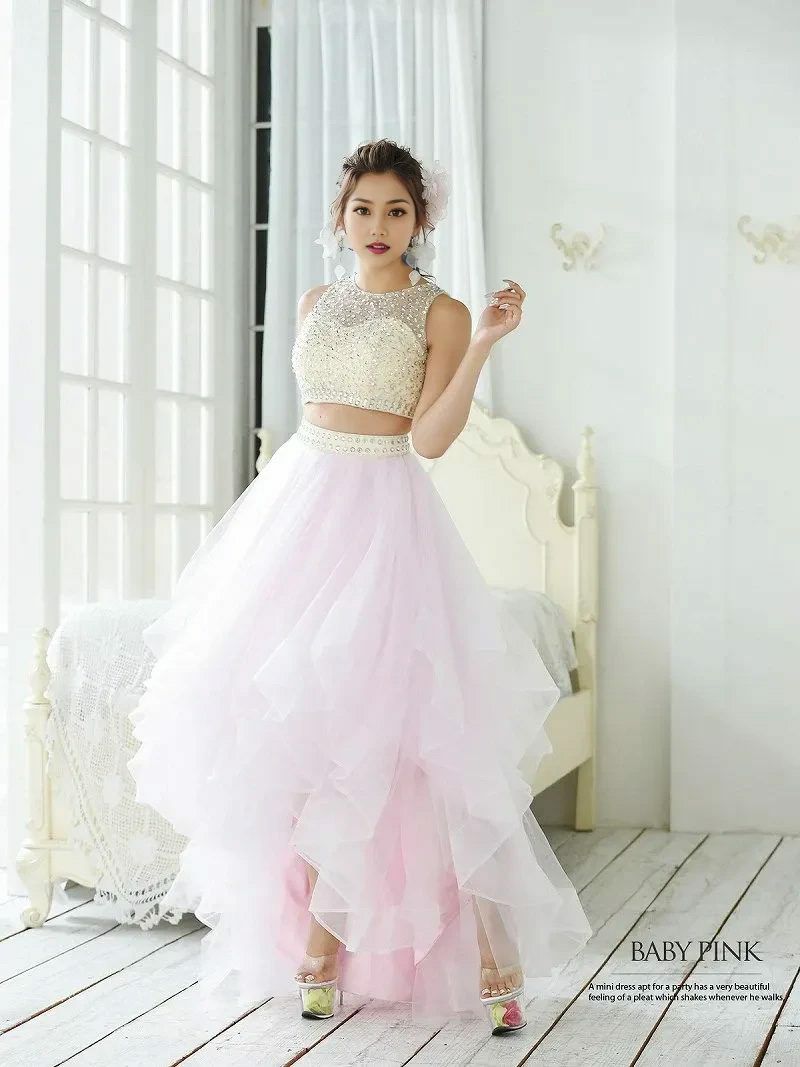 6. 豪華ビジューロングオーガンジー2Pキャバクラドレス【Ryuyu】ノースリーブ前ミニセットアップドレス(S/M/L)(ベビーピンク/チェリーピンク/パープル)