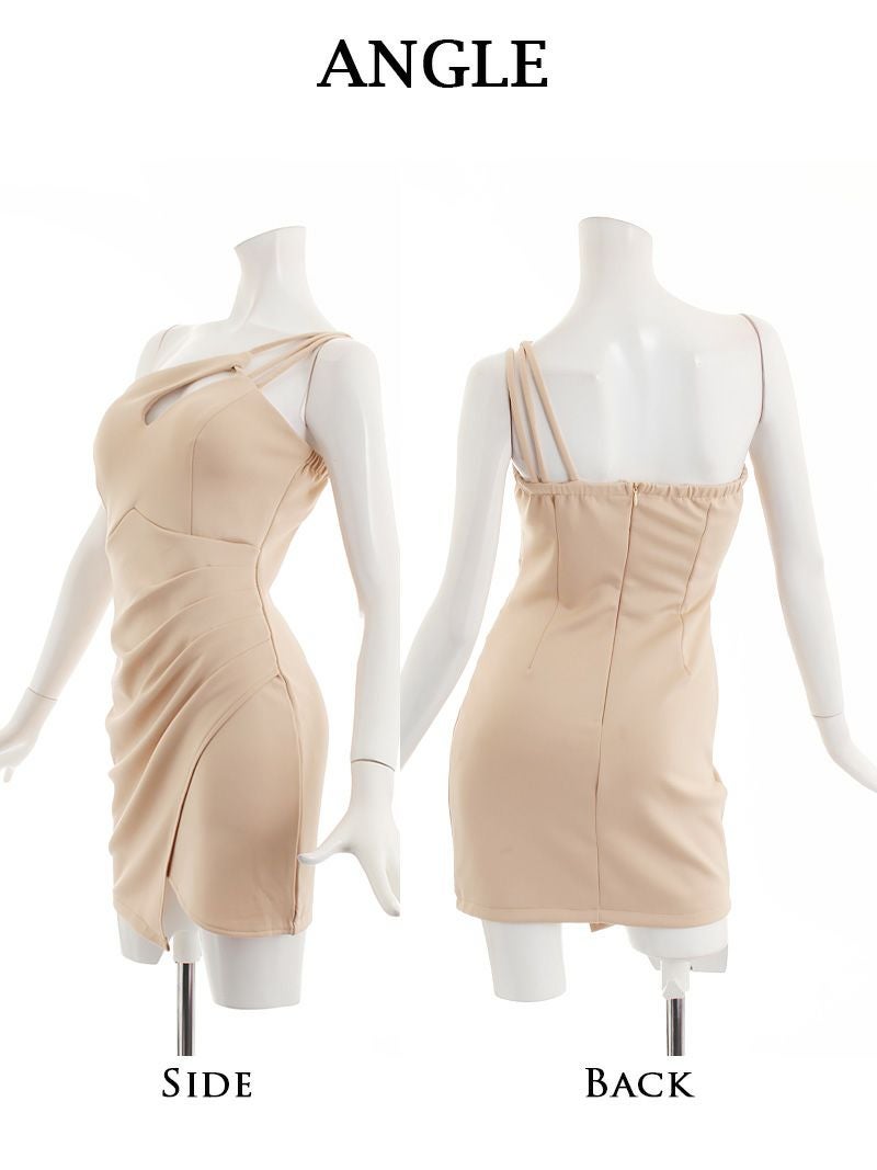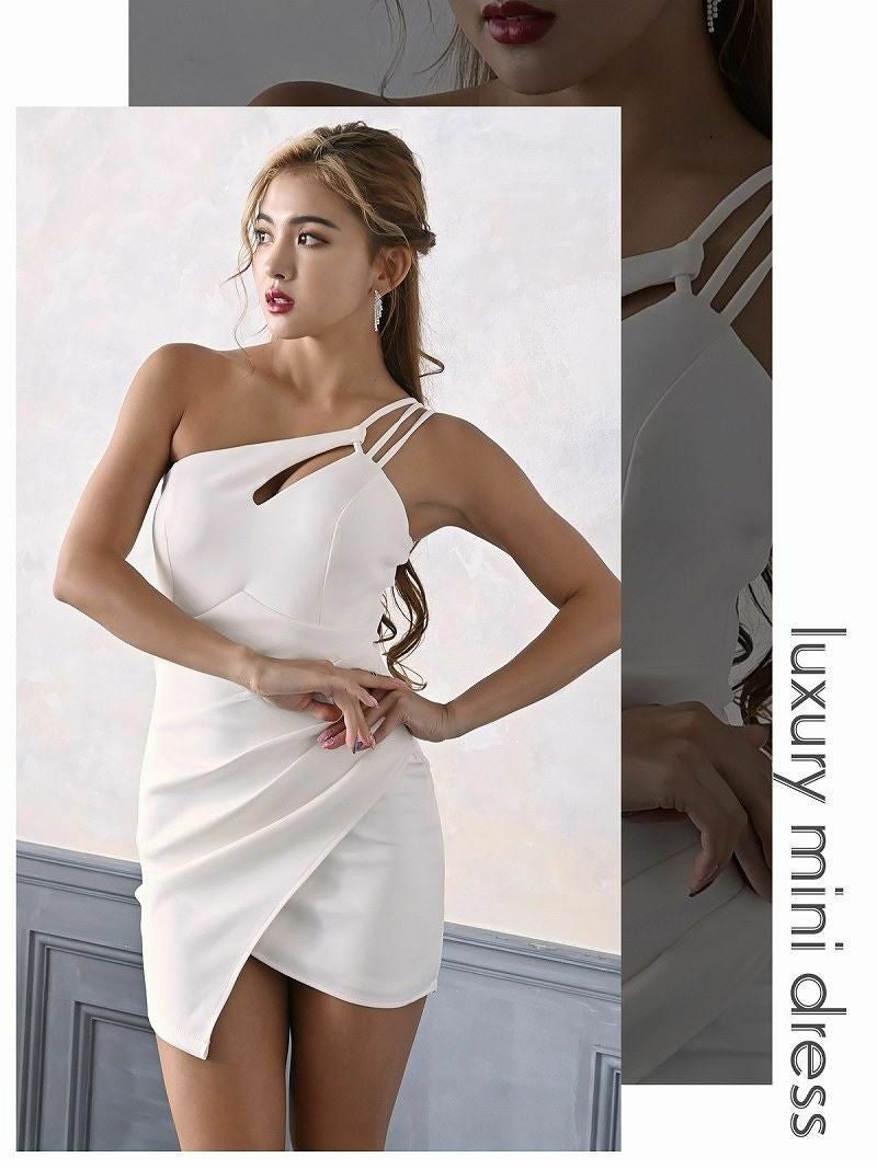 デコルテラインを大胆に見せるワンショルダーのアシンメトリーデザインが魅力的なミニドレスです。