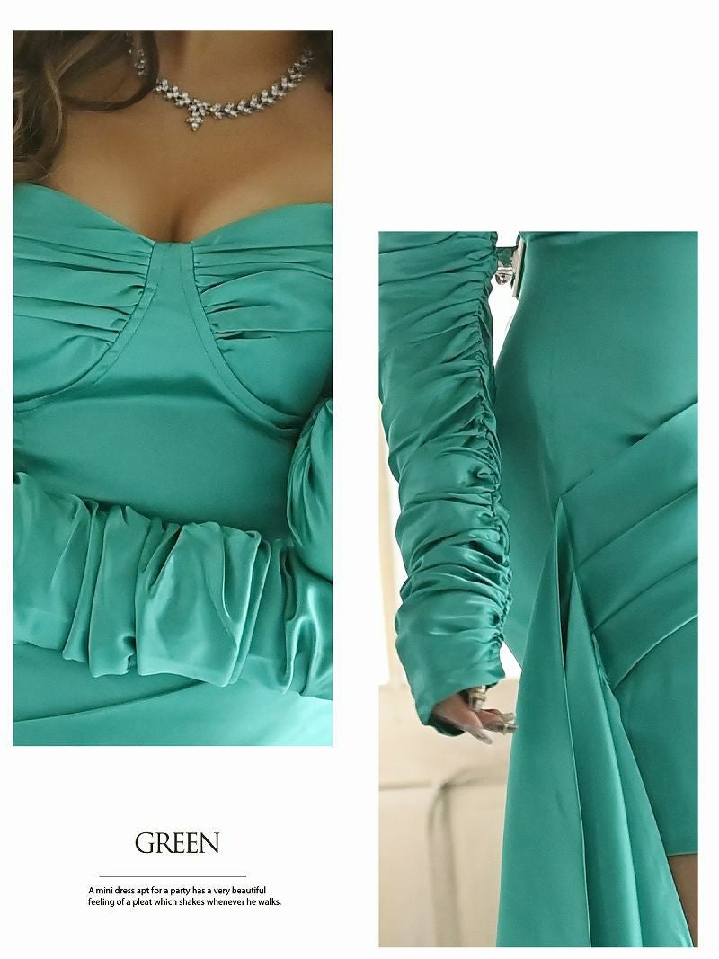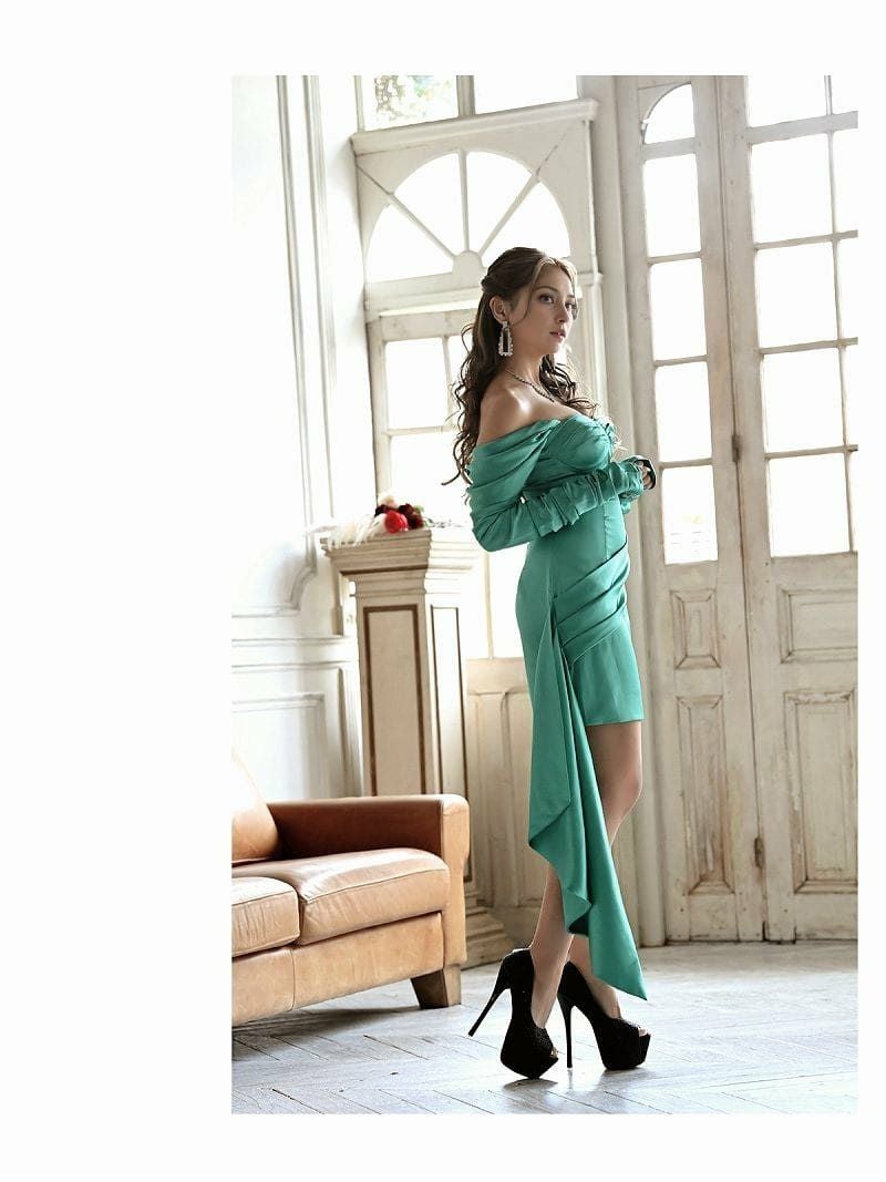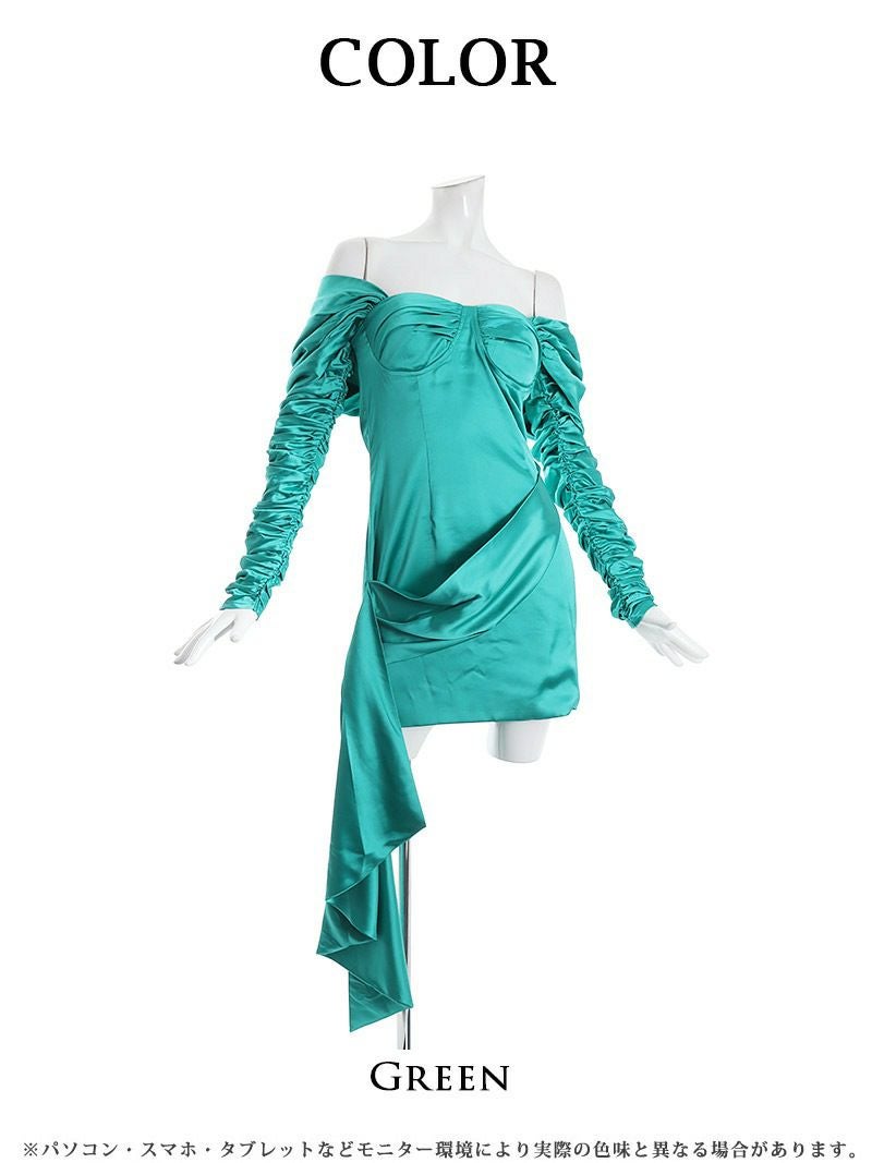 オフショルダー袖付きグリーンカラーサテンキャバドレス【BelsiaLUX】
