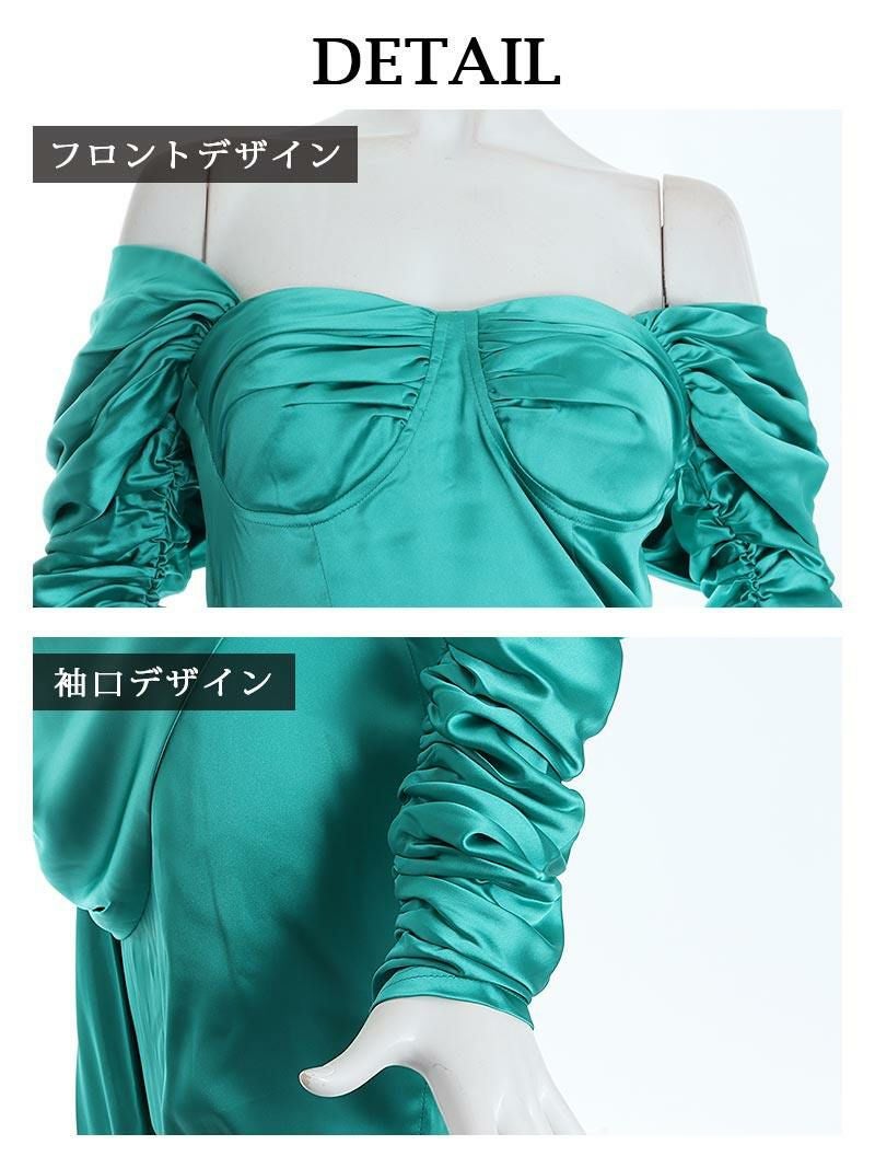 5. オフショルダー袖付きグリーンカラーサテンキャバドレス【BelsiaLUX】(M/L)(グリーン)