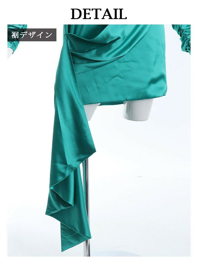 7. オフショルダー袖付きグリーンカラーサテンキャバドレス【BelsiaLUX】(M/L)(グリーン)