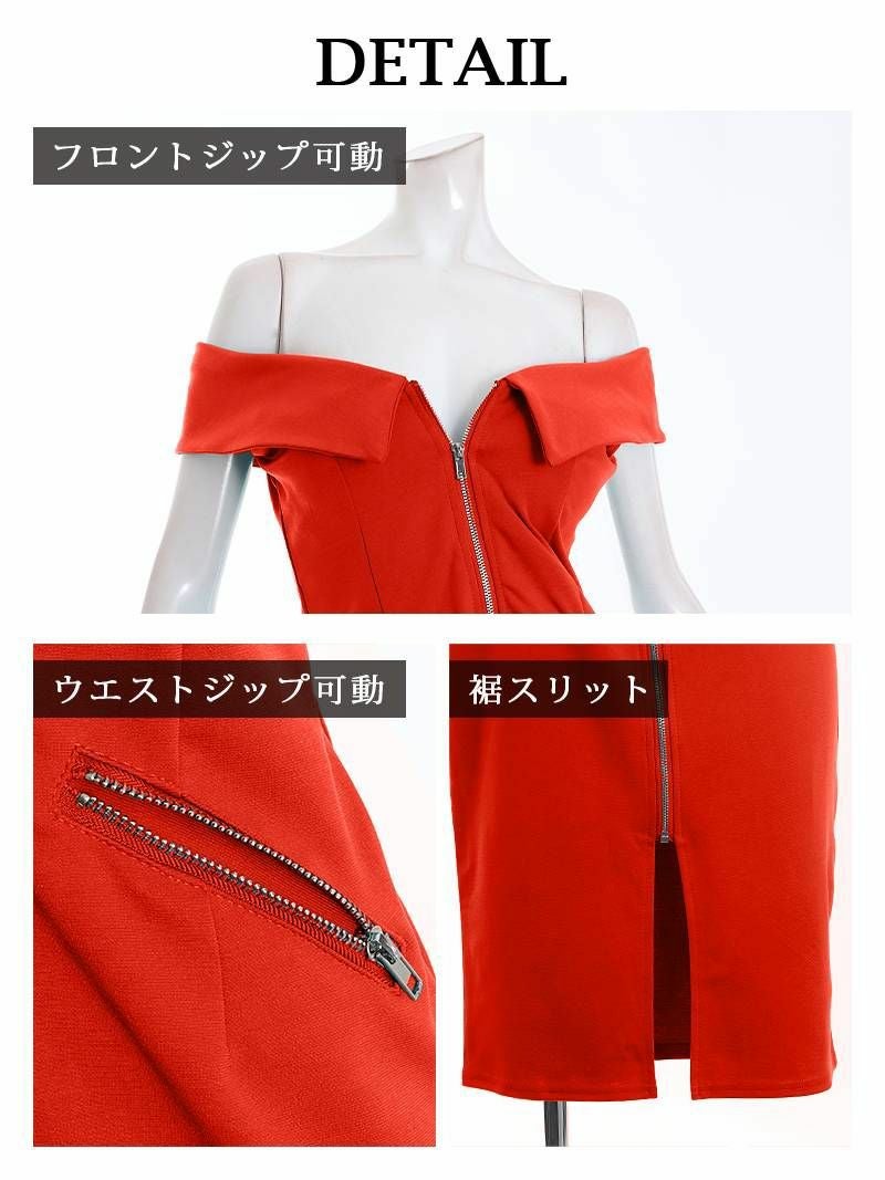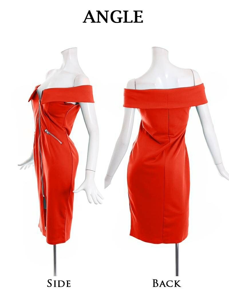 オフショルドレスは適度な露出が色気UP!更にフロントのジップデザインは自分の好みの位置で下げることができるから程よい位置で谷間をアピールし、お客様をドキドキさせるキャバ嬢ワンピースです。