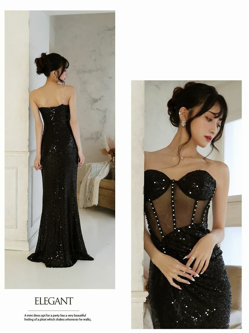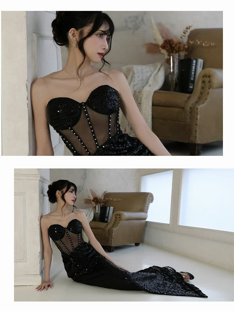 5. ブラックシアーコルセット風インポートロングドレス 加賀美早紀 着用キャバドレス【BelsiaLUX】(M/L)(ブラック)