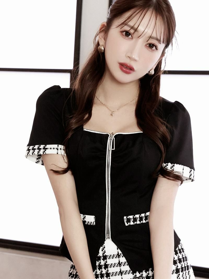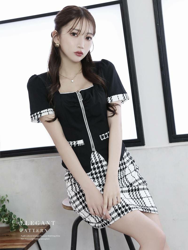 モノトーン×チェック柄が大人かわいく着こなせるキャバドレスです。
