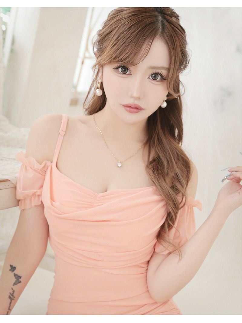オフショル×メッシュ素材でデコルテがきれいに映え、小顔効果も◎なキャバドレスです