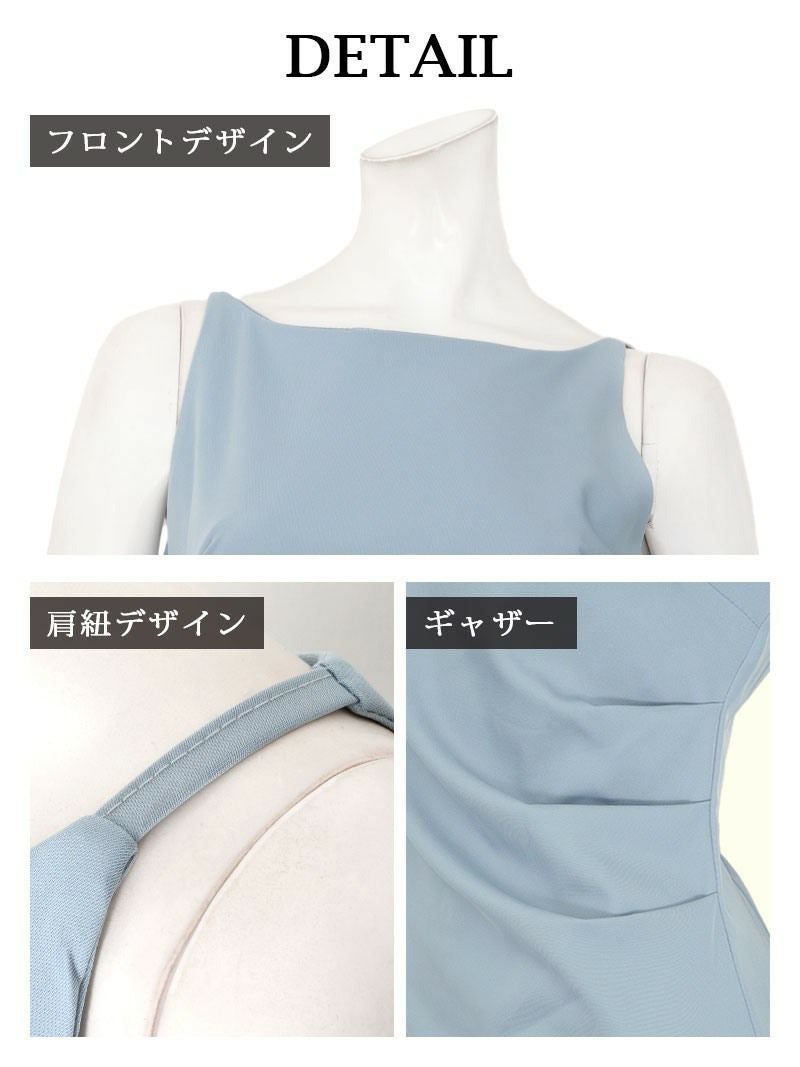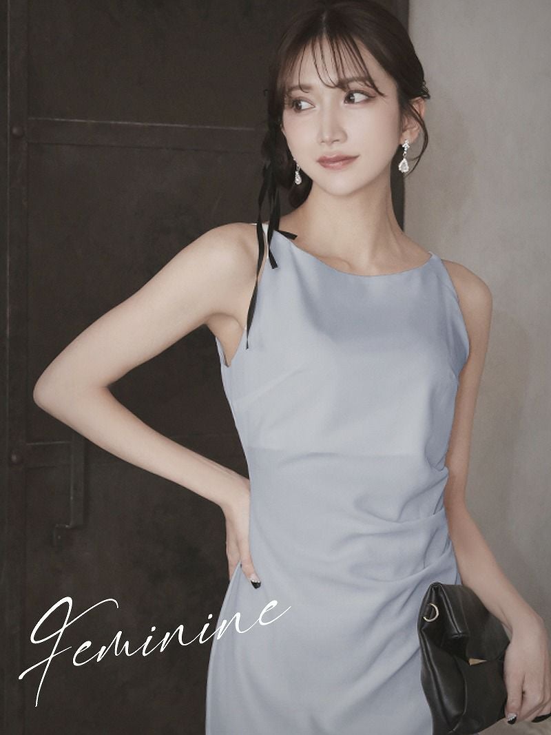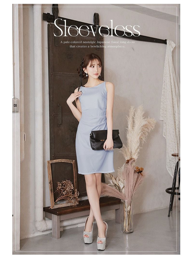 ノースリーブでデコルテ周りをすっきり見せ、女性らしい華奢なラインを演出します。